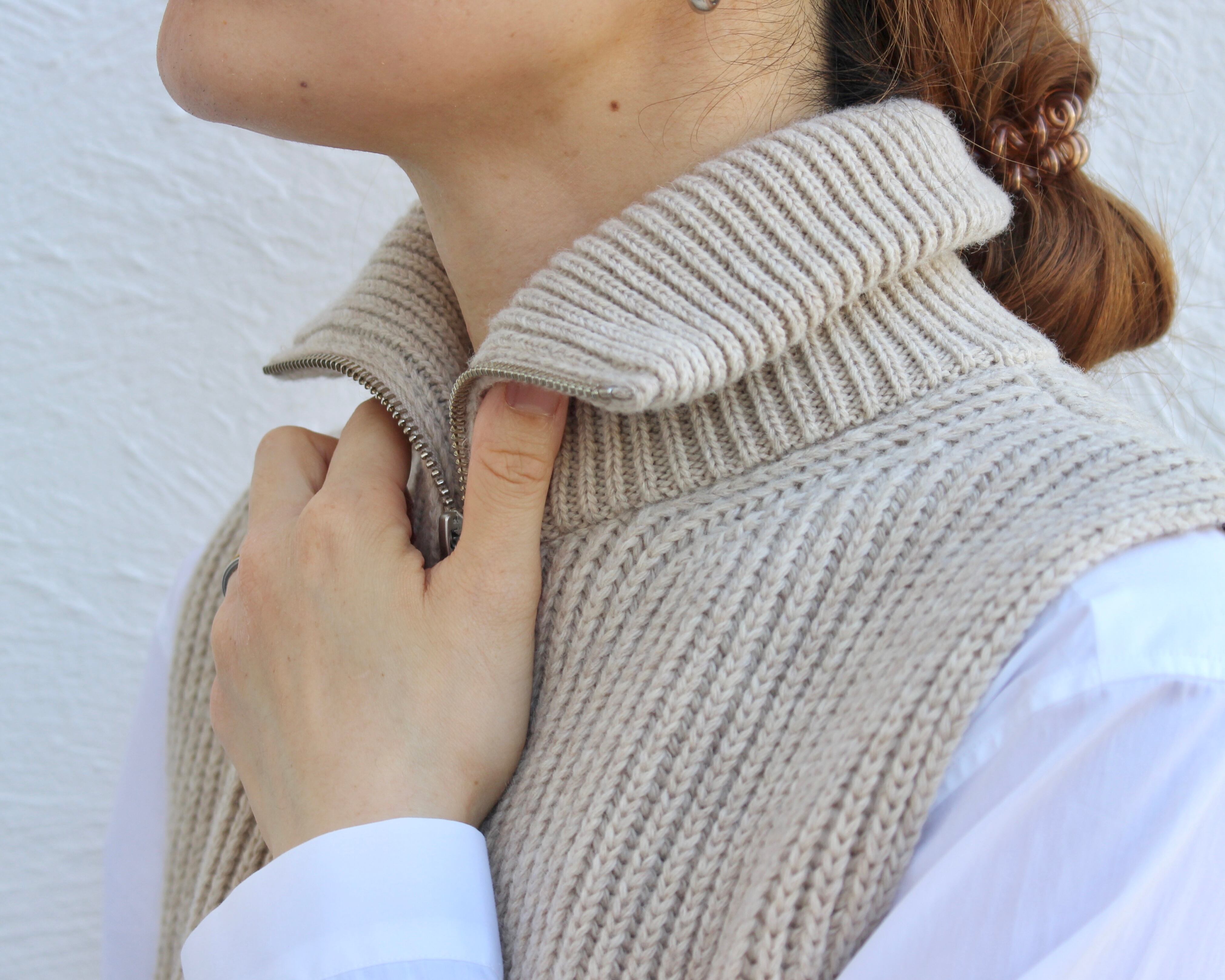 柔らかなベージュカラーで、モード感のある白シャツやスラックスパンツとも