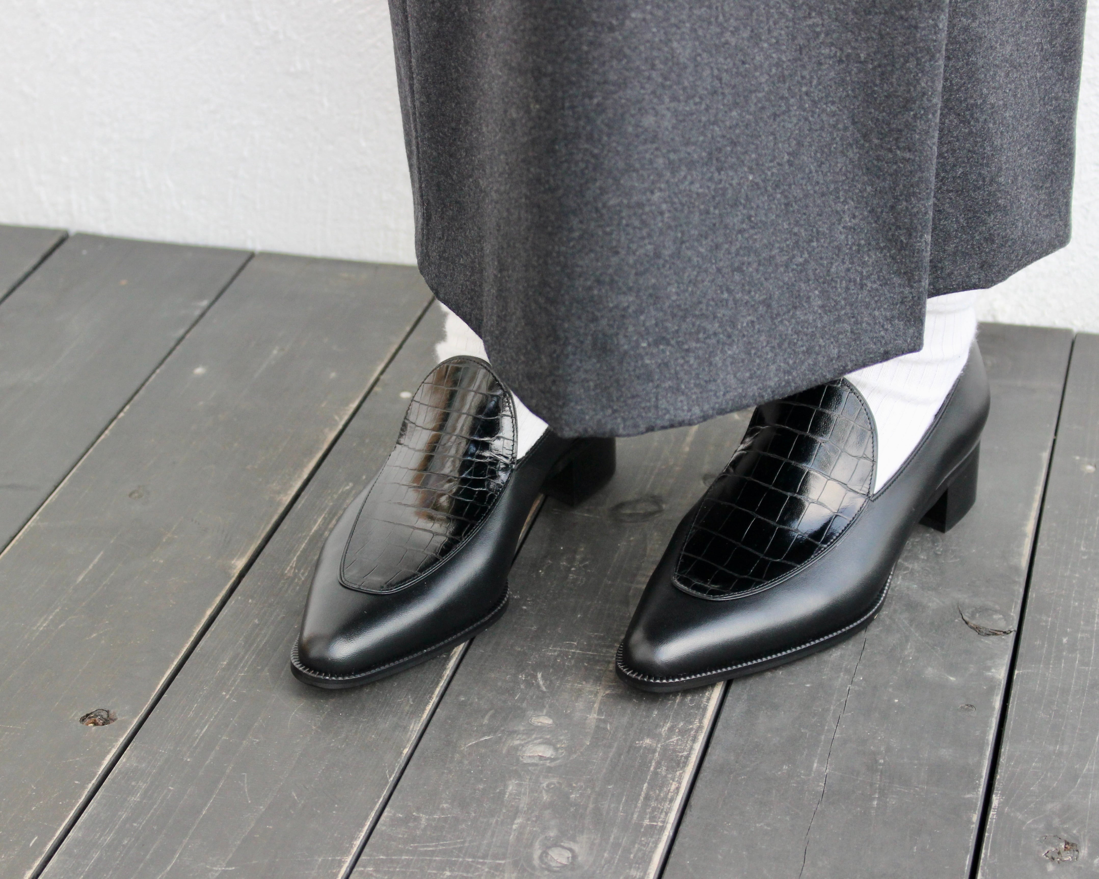 プレーンなポインテッドトウスリッポンはクロコレザーとの組み合わせがおしゃれ。