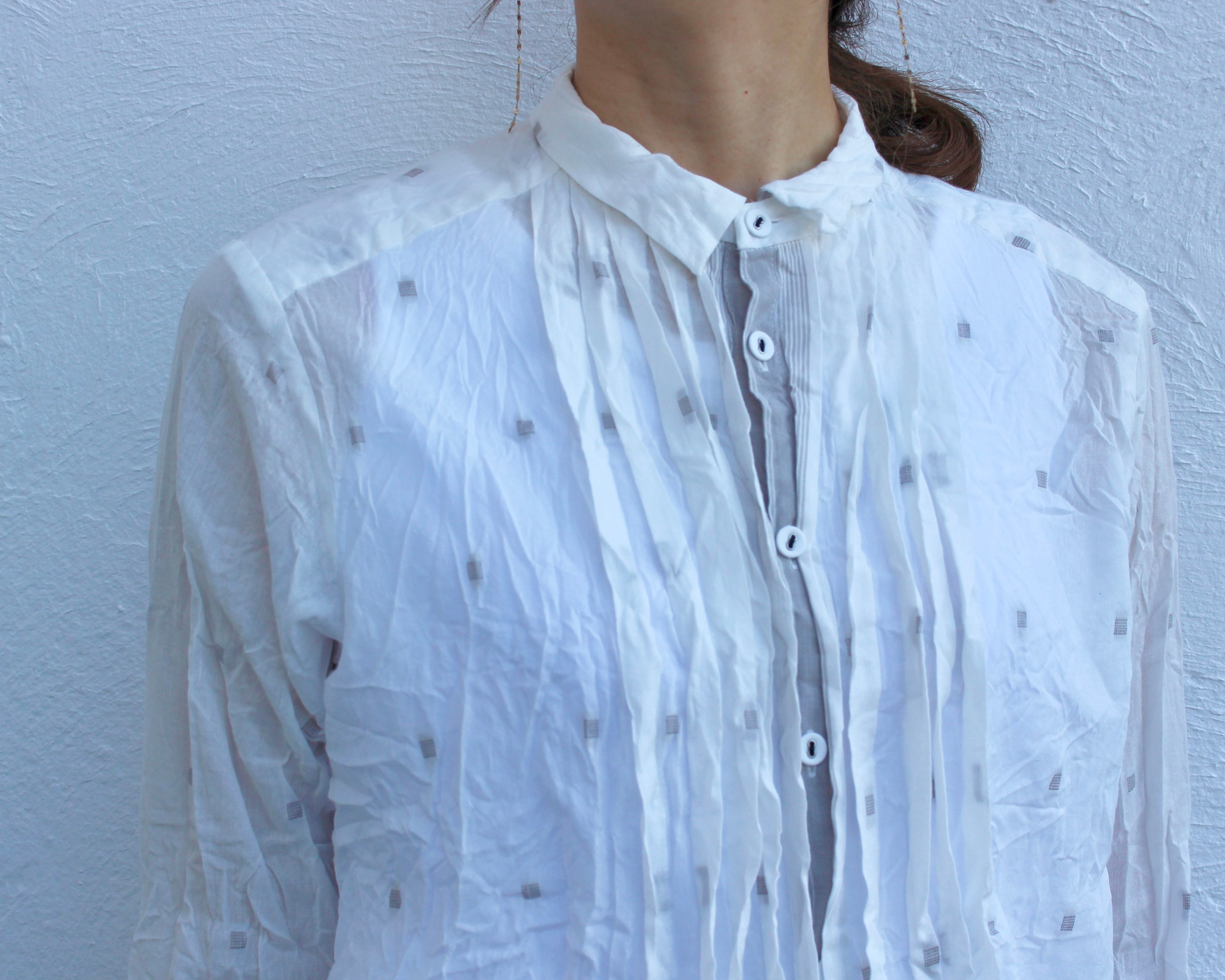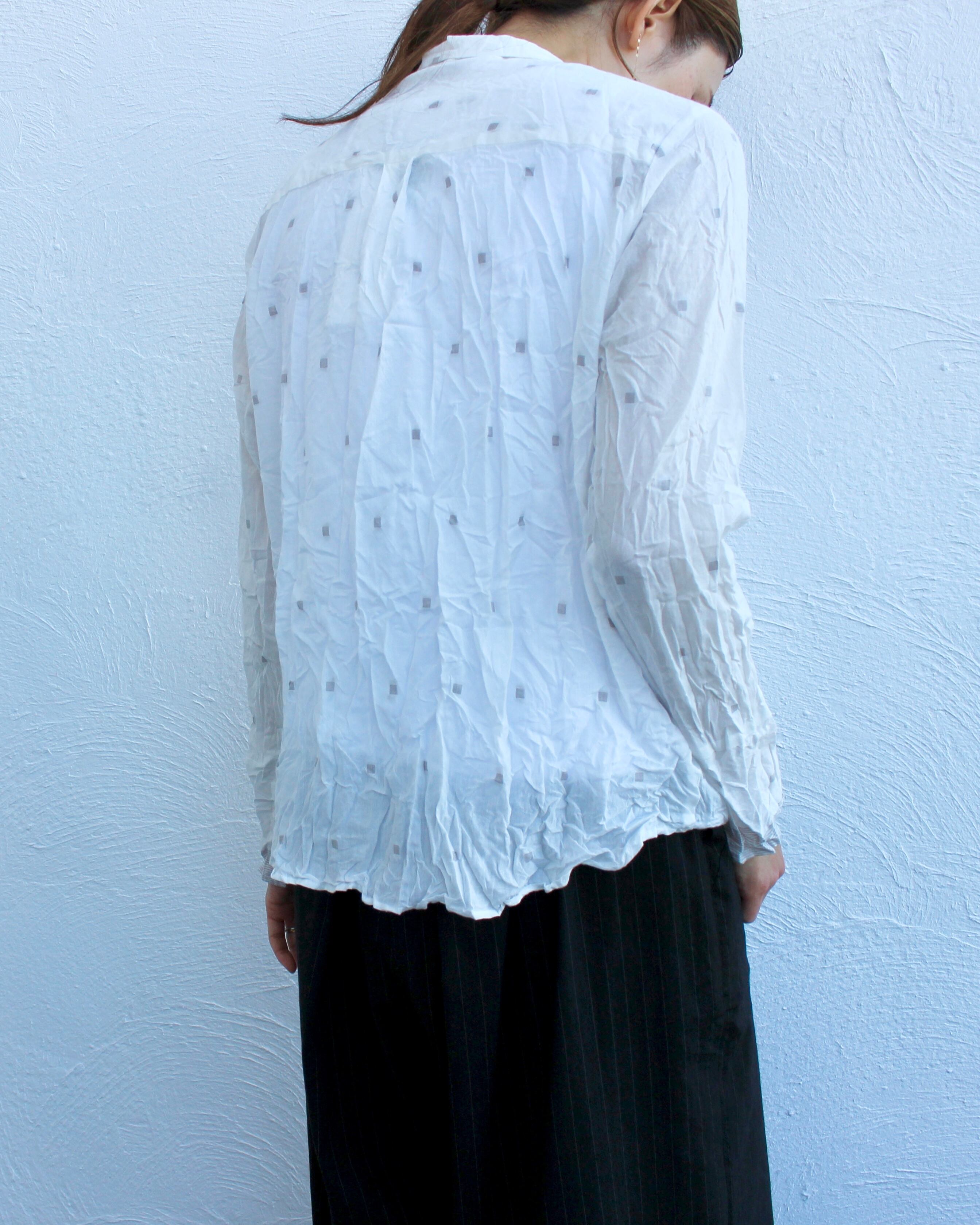 ドビー織り機でダイヤのパターン模様を織り上げたブラウス。