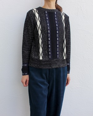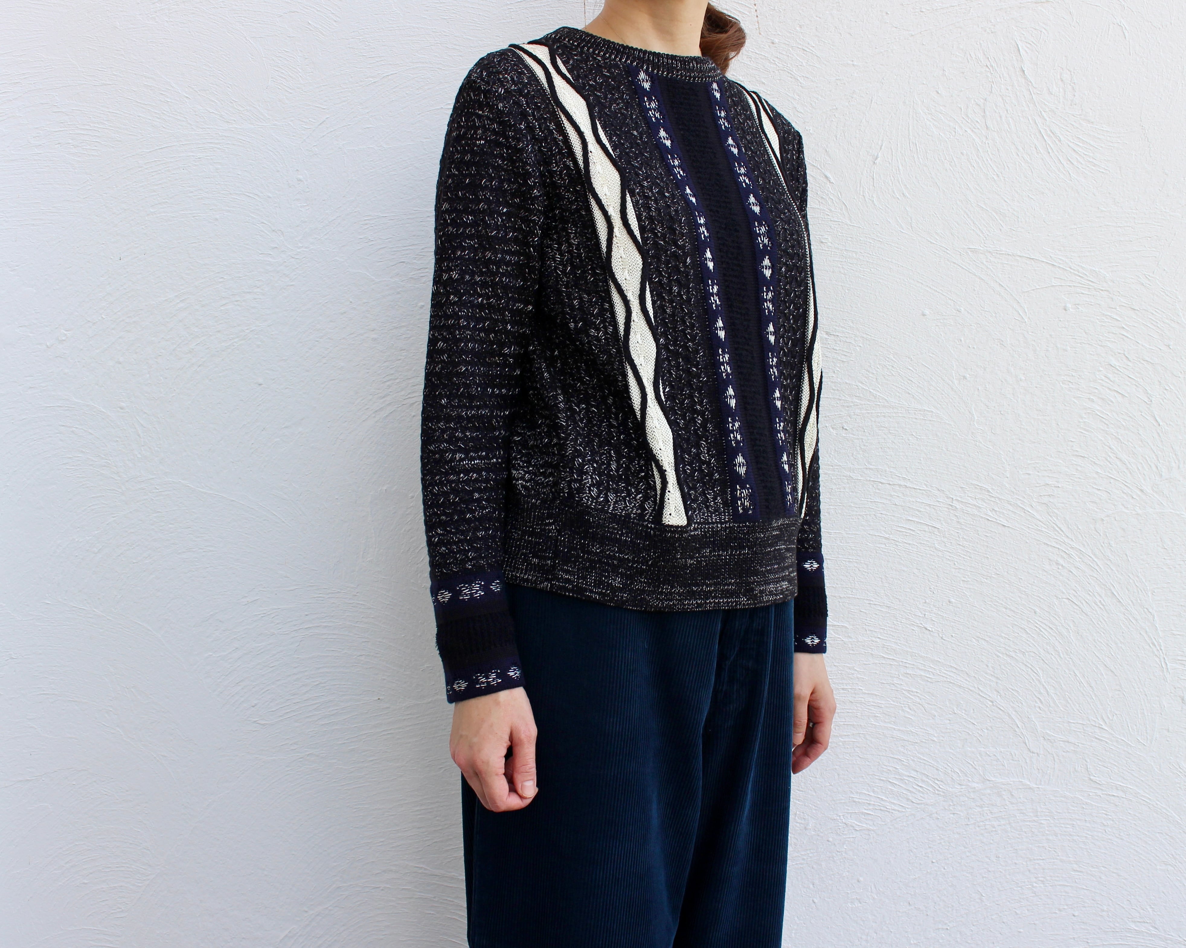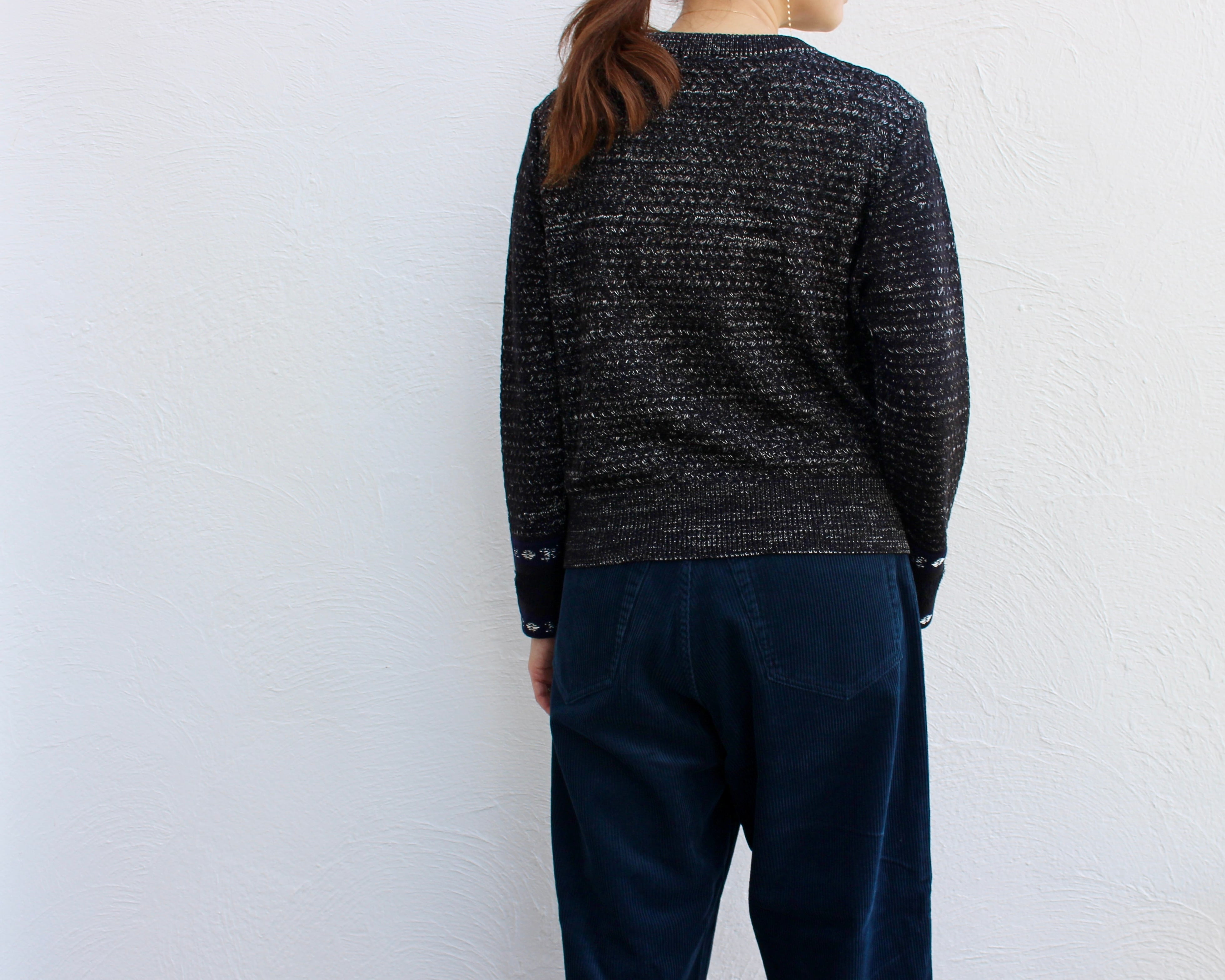 3色の糸に加えて、毛足の長い糸やレーヨン糸を編み分けて、