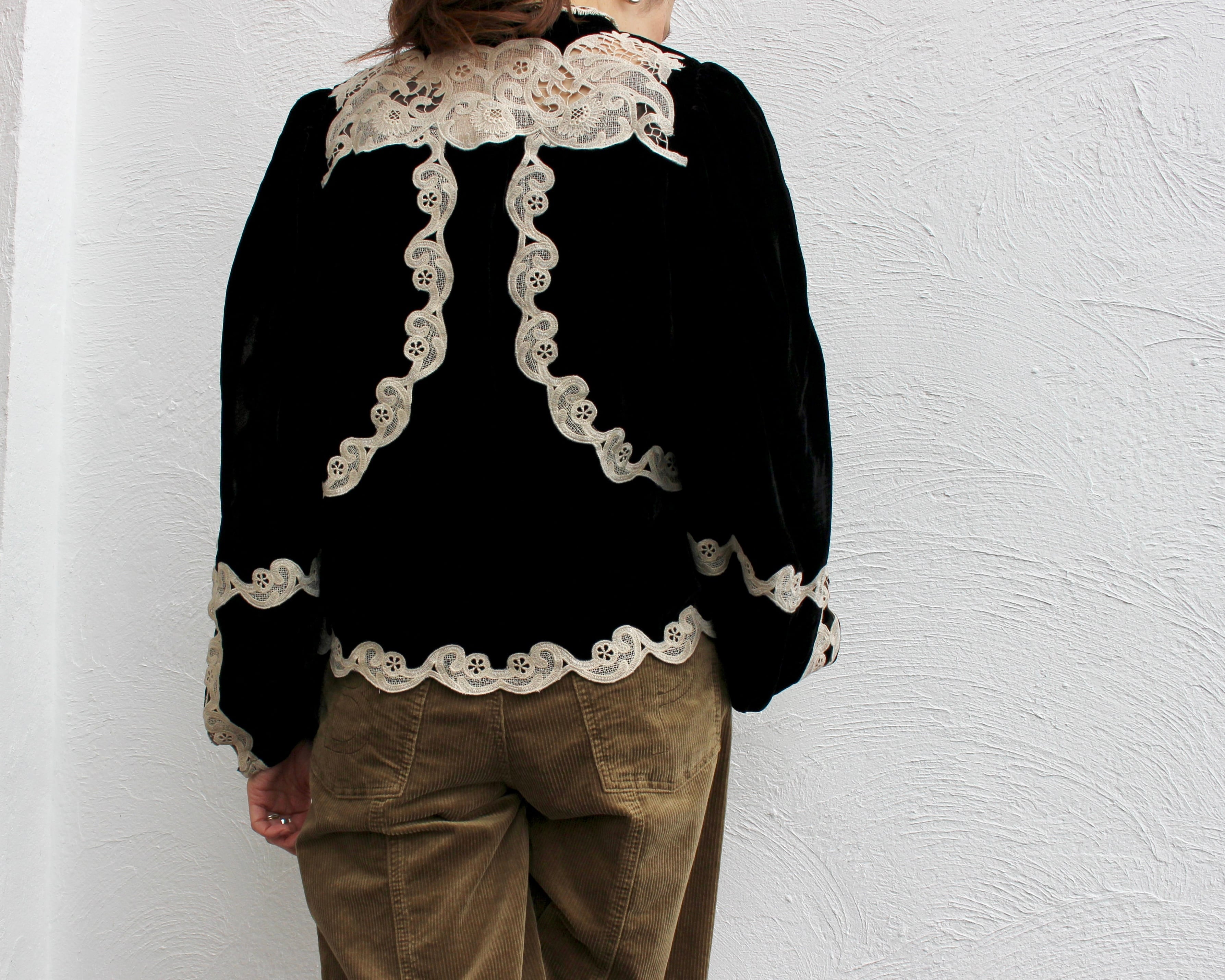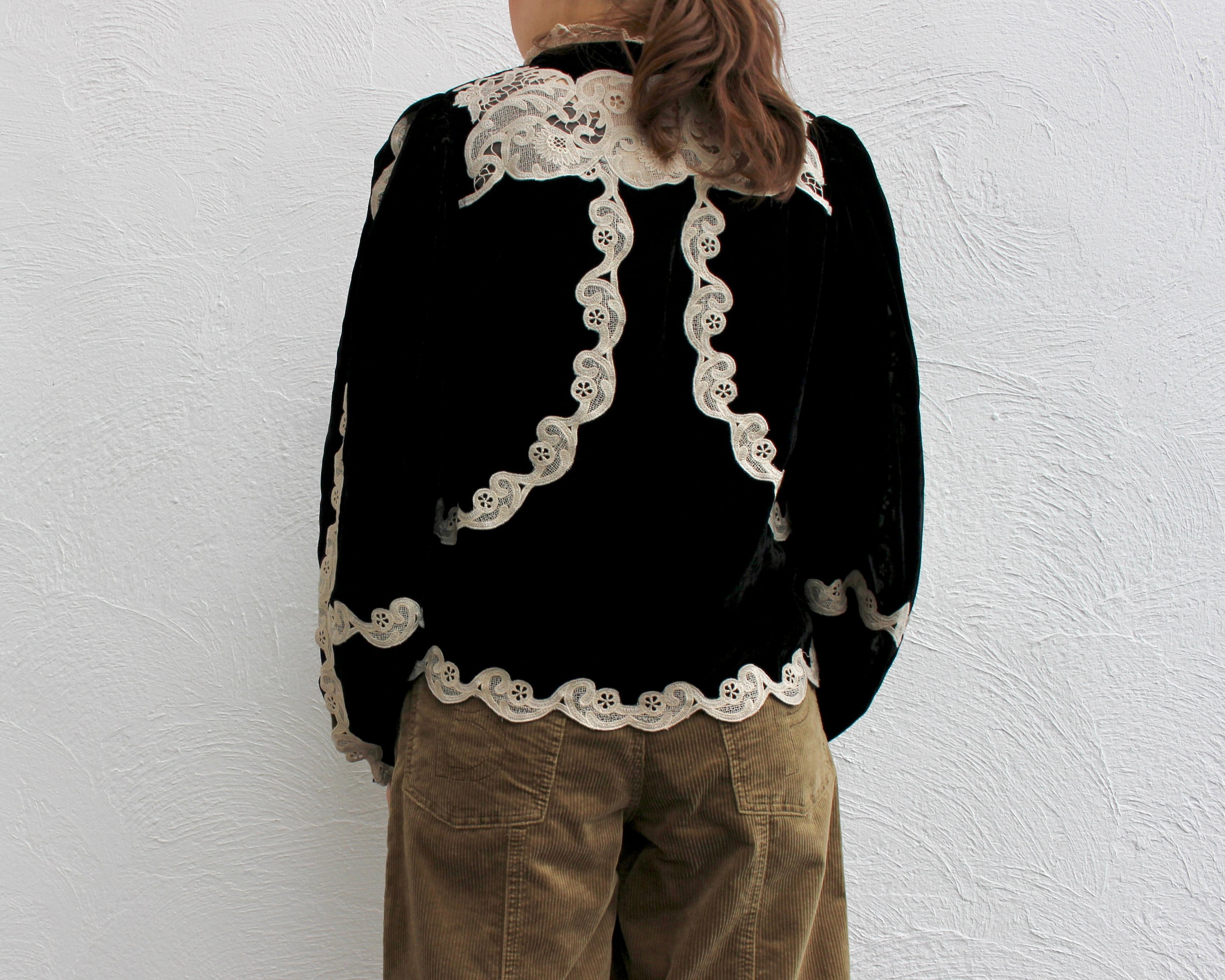 ベロアにデコラティブなレースをあしらったブラウス。