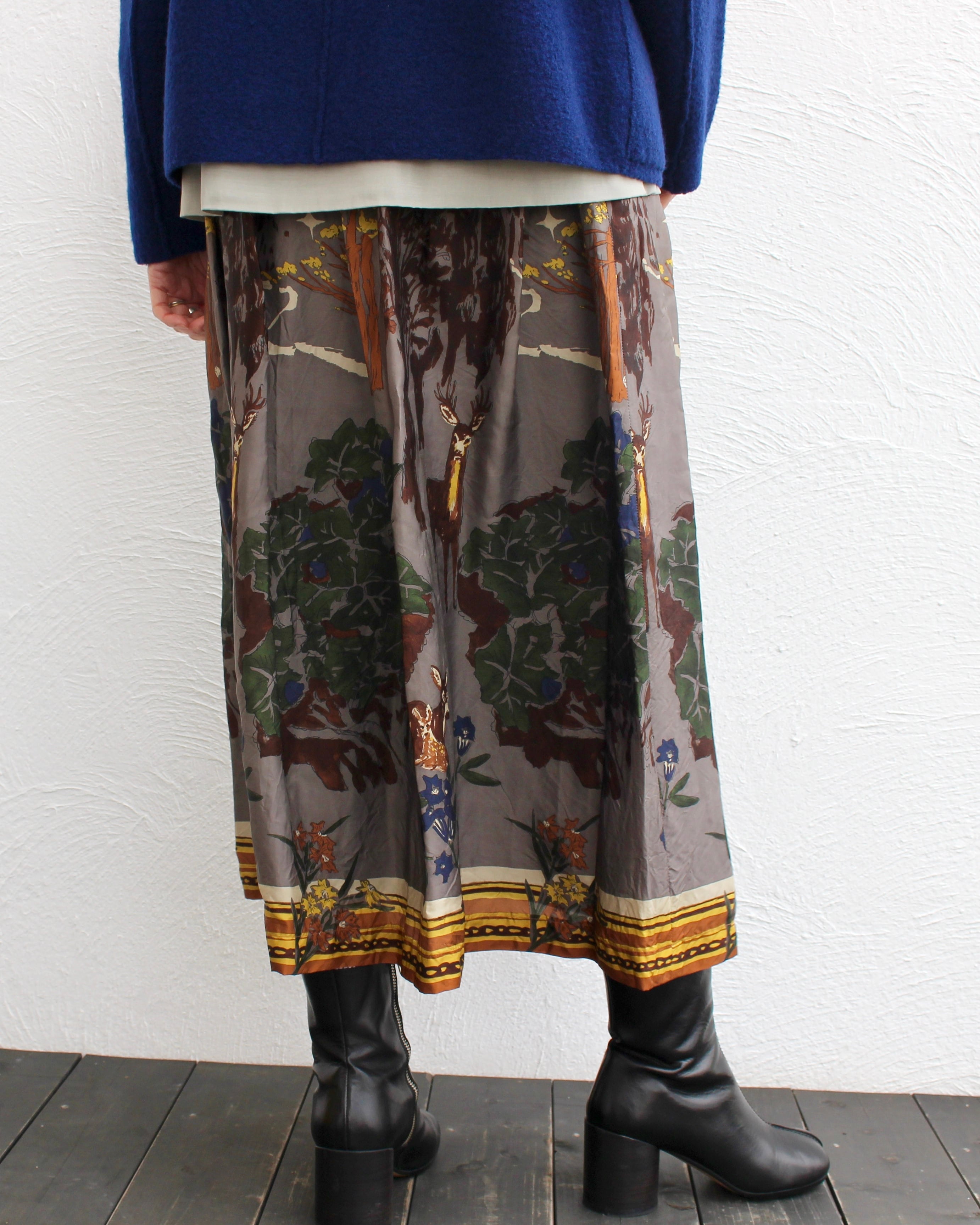 幻想的なプリントと艶やかな生地感が魅力的なスカート。