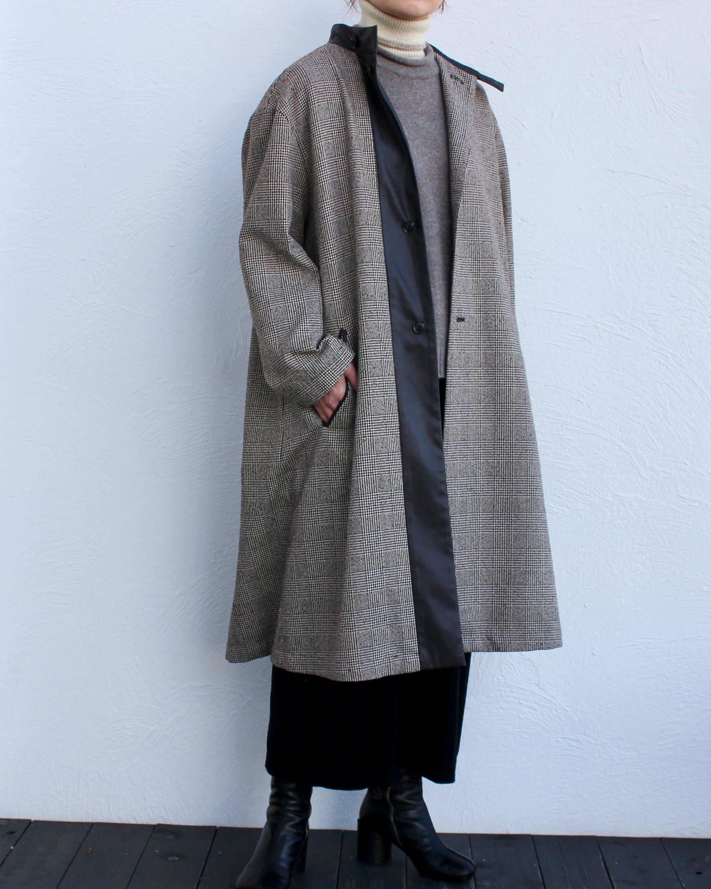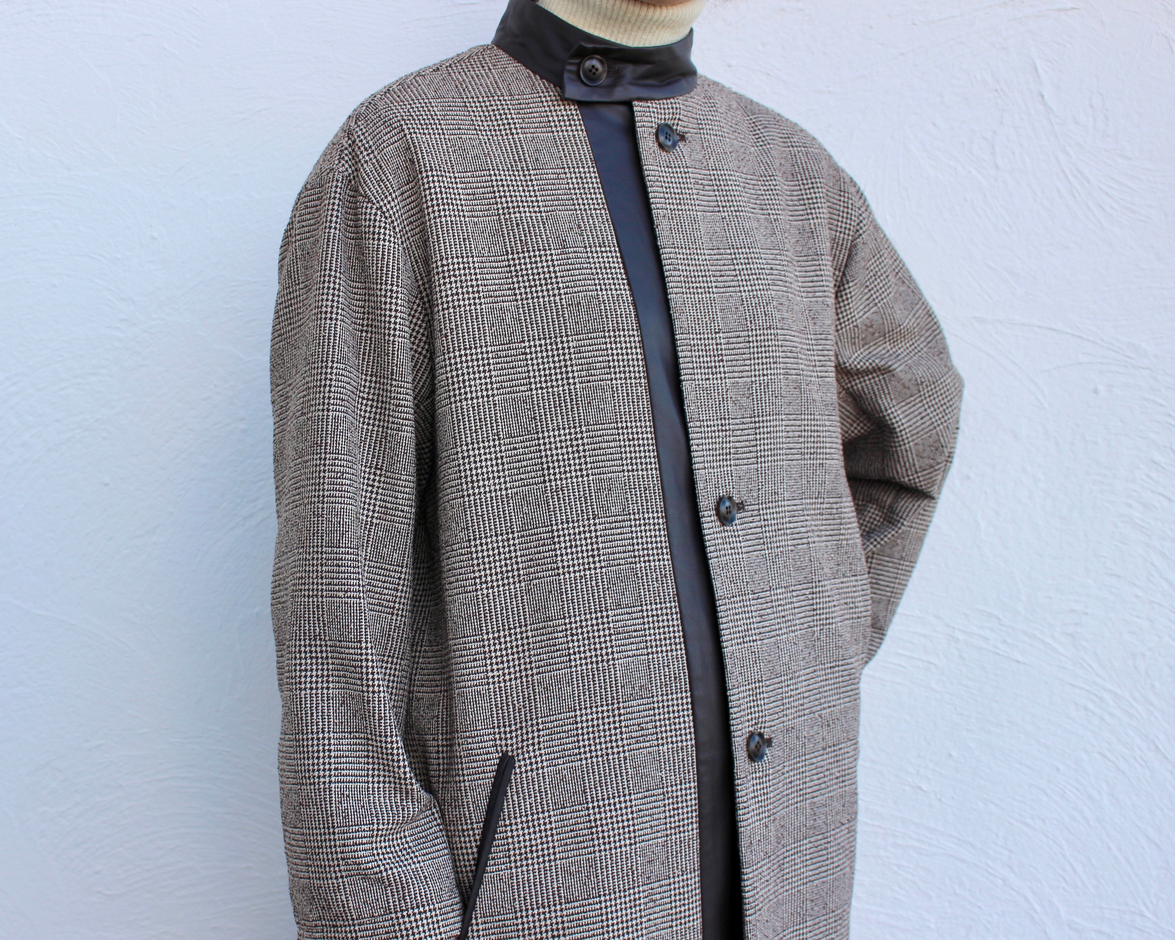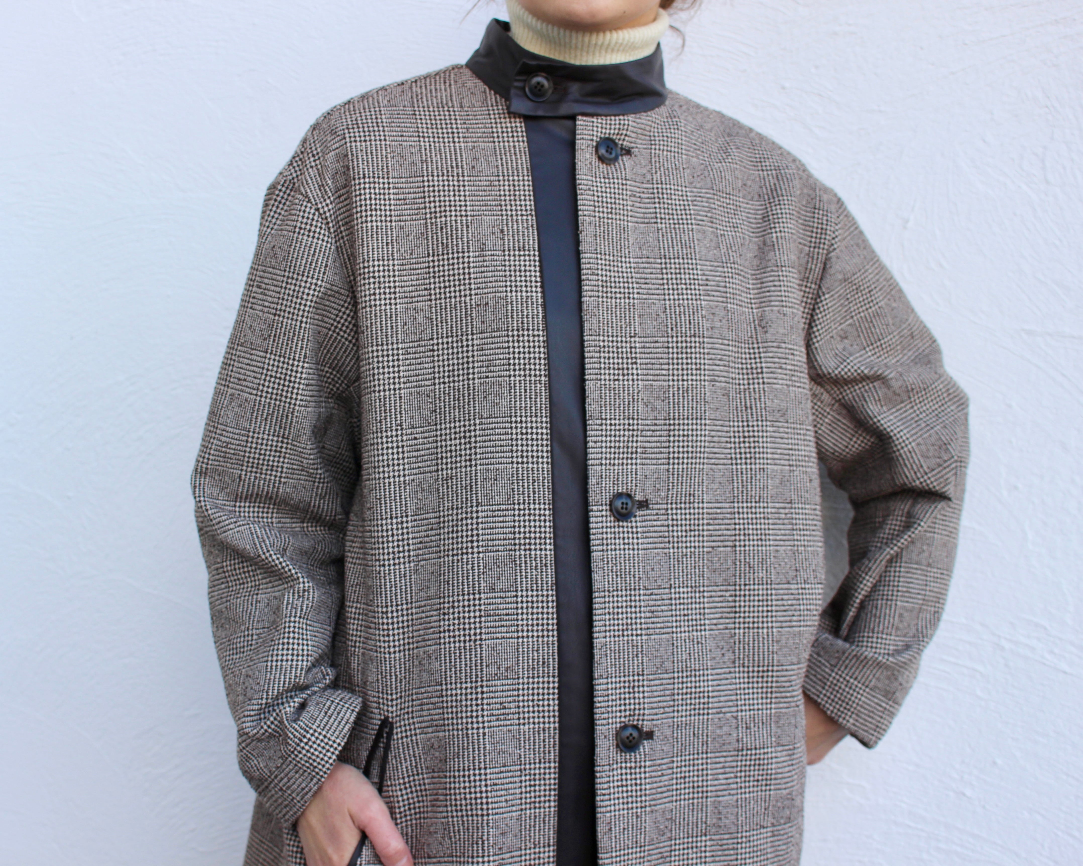 ツイード調に仕上げたグレンチェック生地とフェイクレザーも異素材使いが