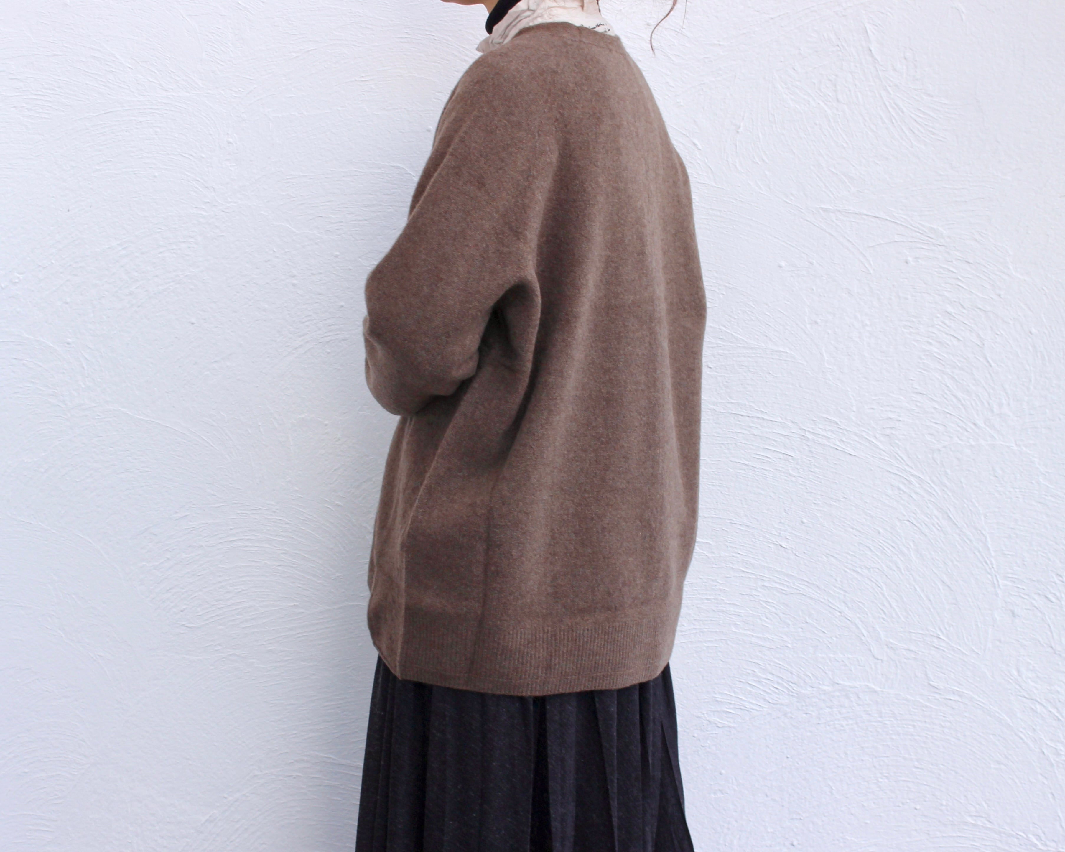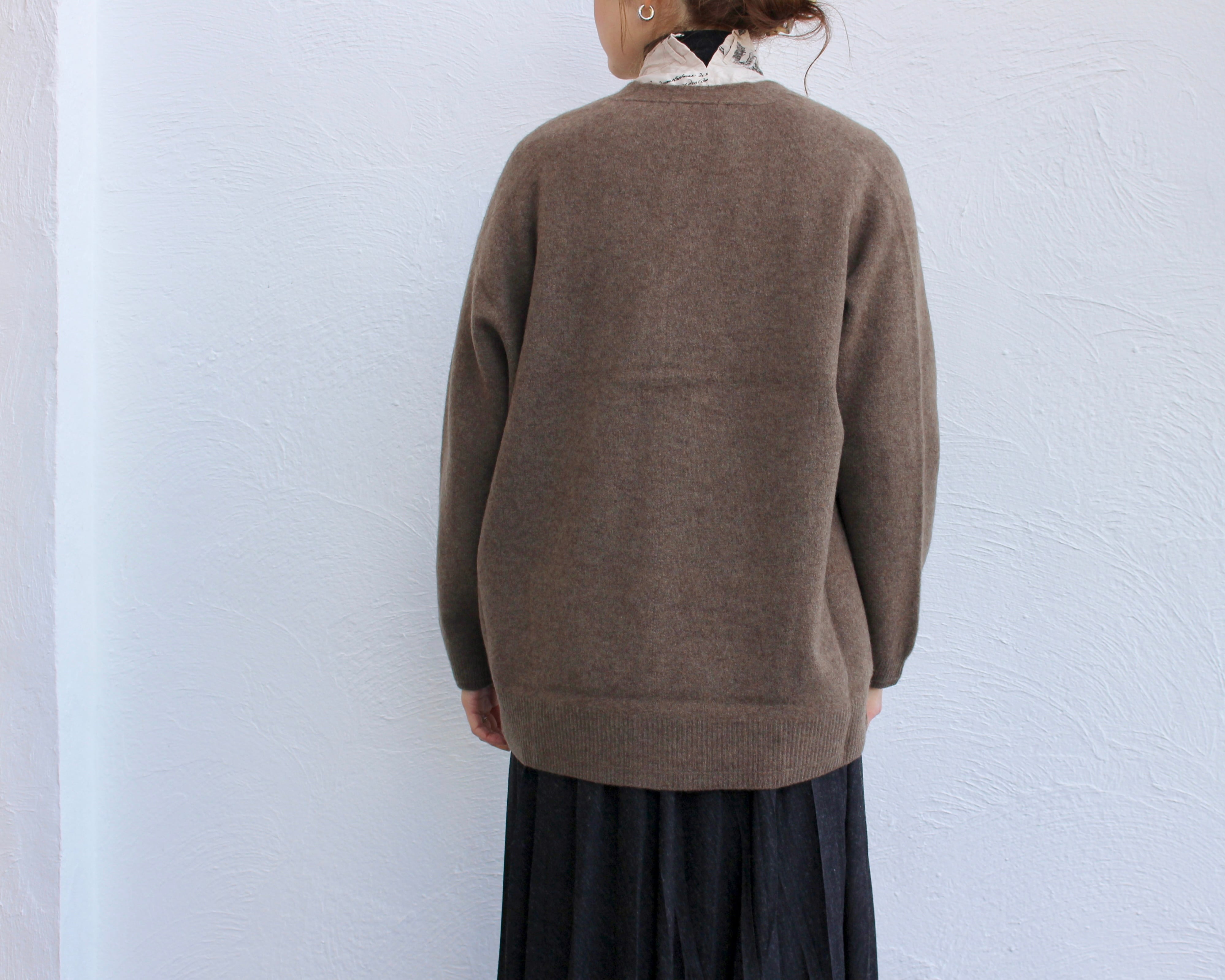 メリノファインウールに縮絨をかけて高密度で軽く仕上げたVネックカーディガン。