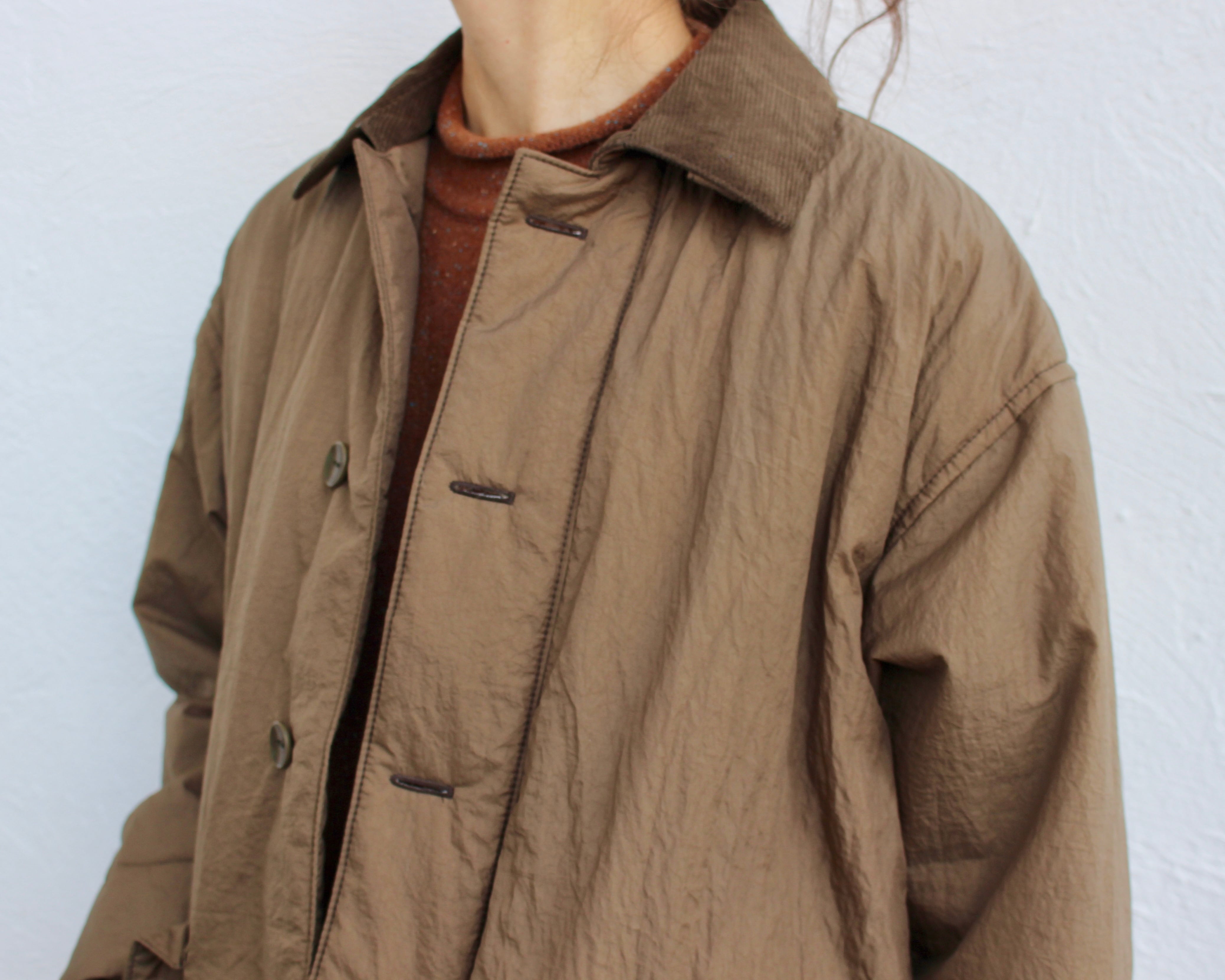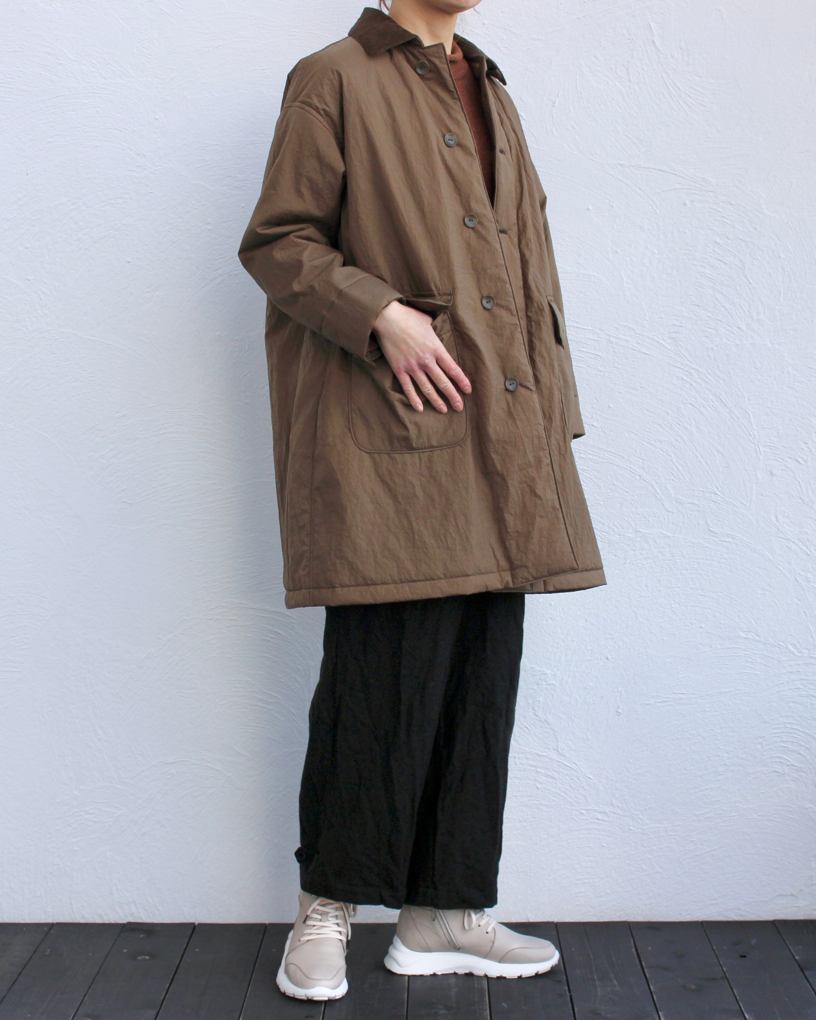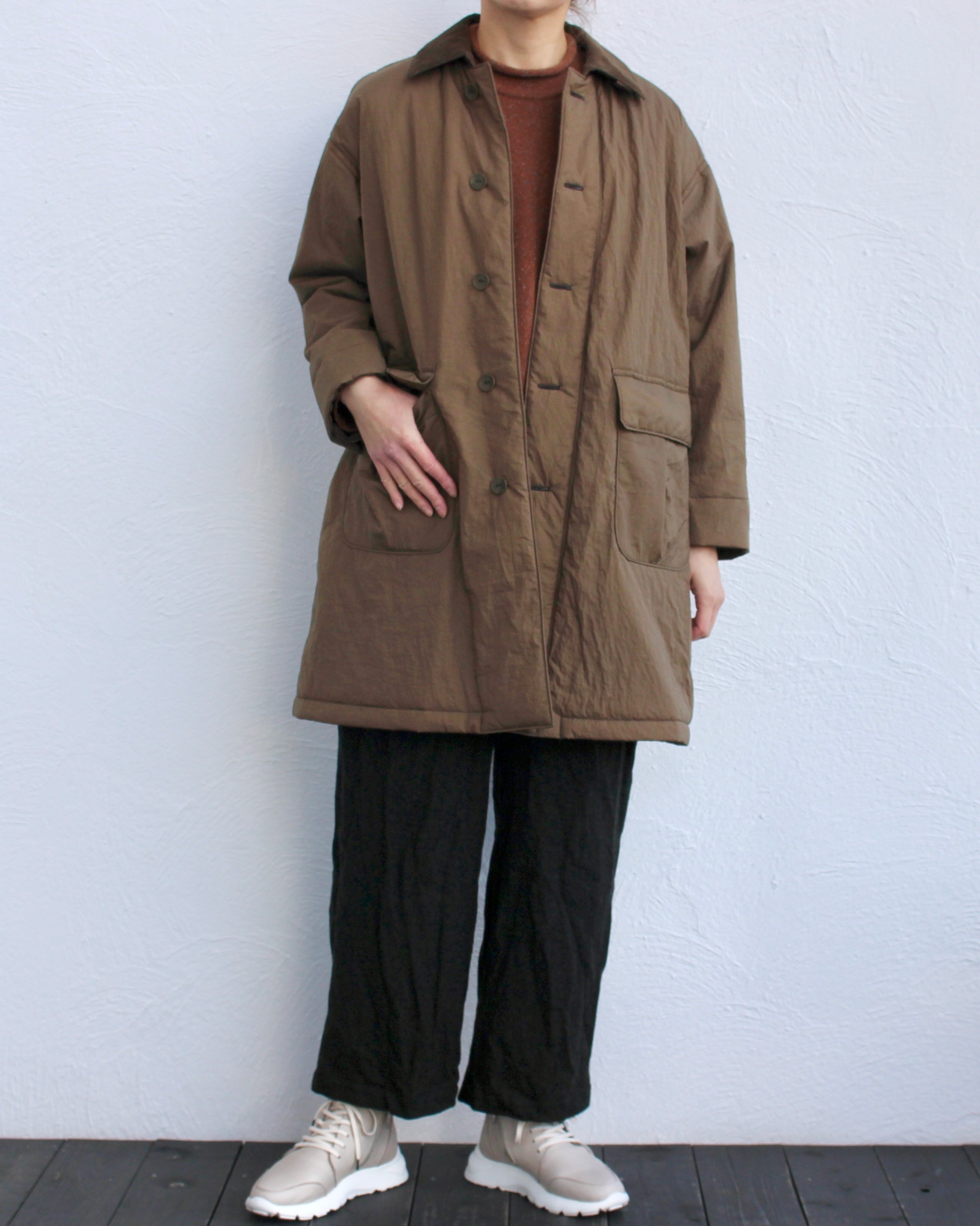 ゆったりとオーバーサイズの中綿入りステンカラーコート。