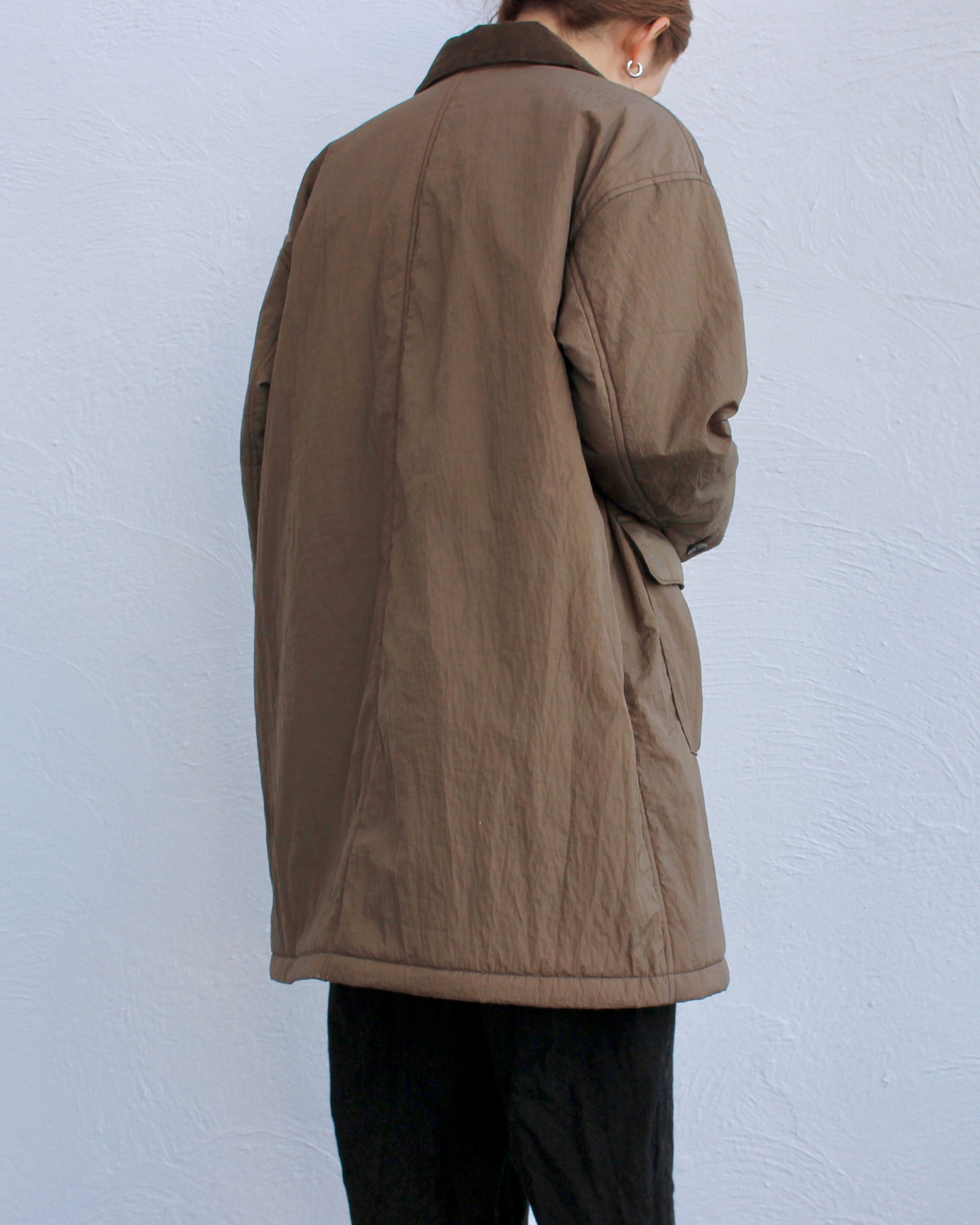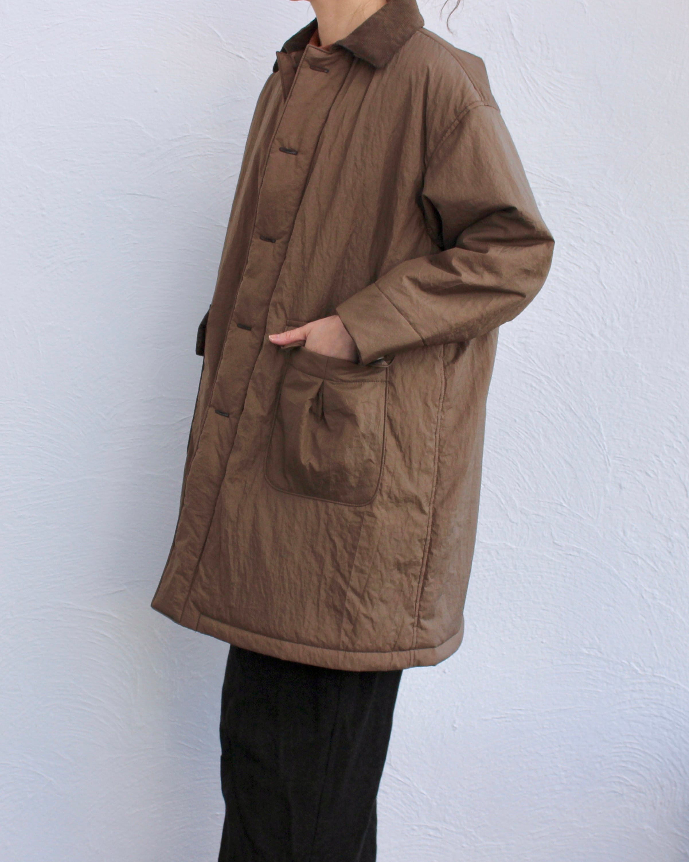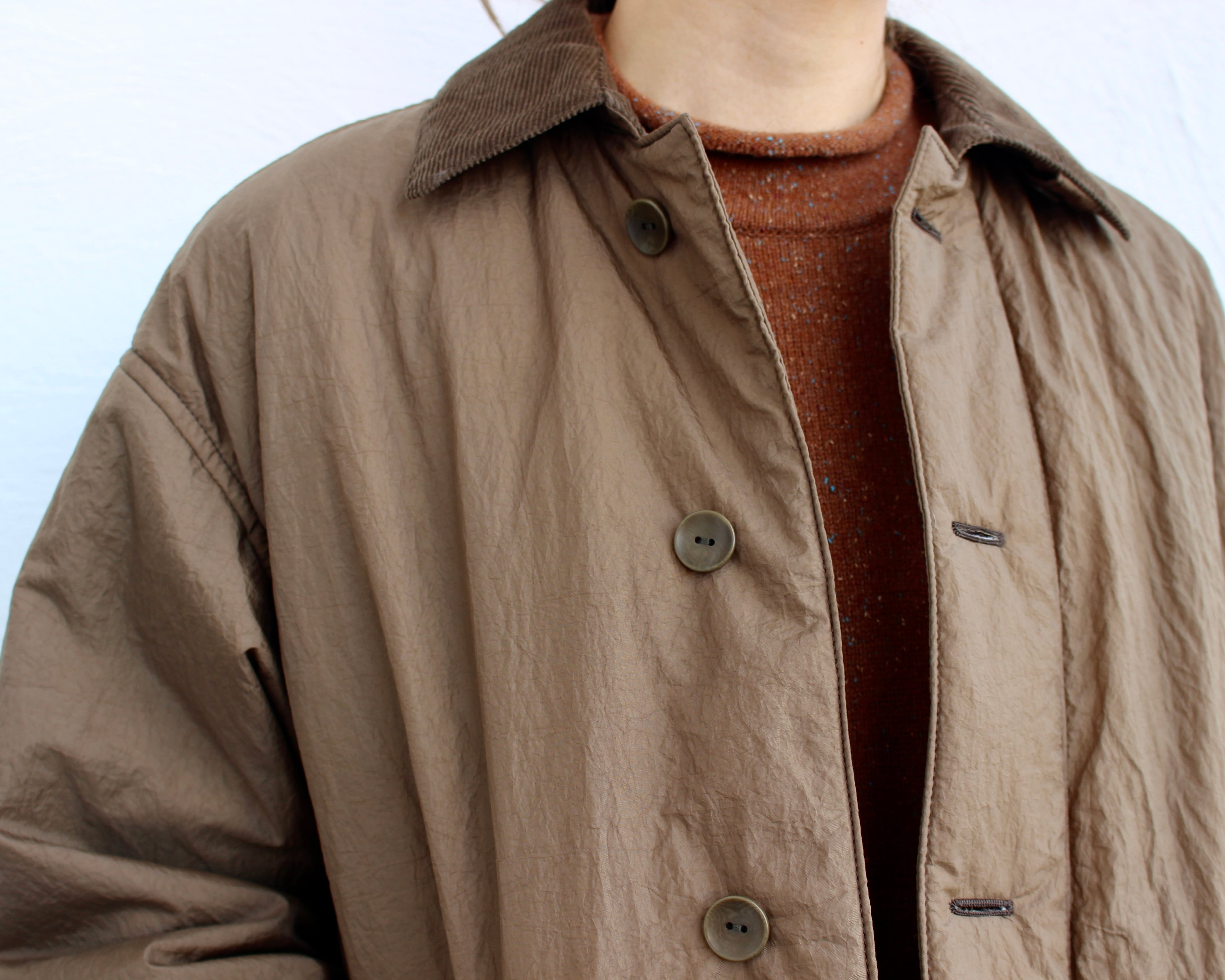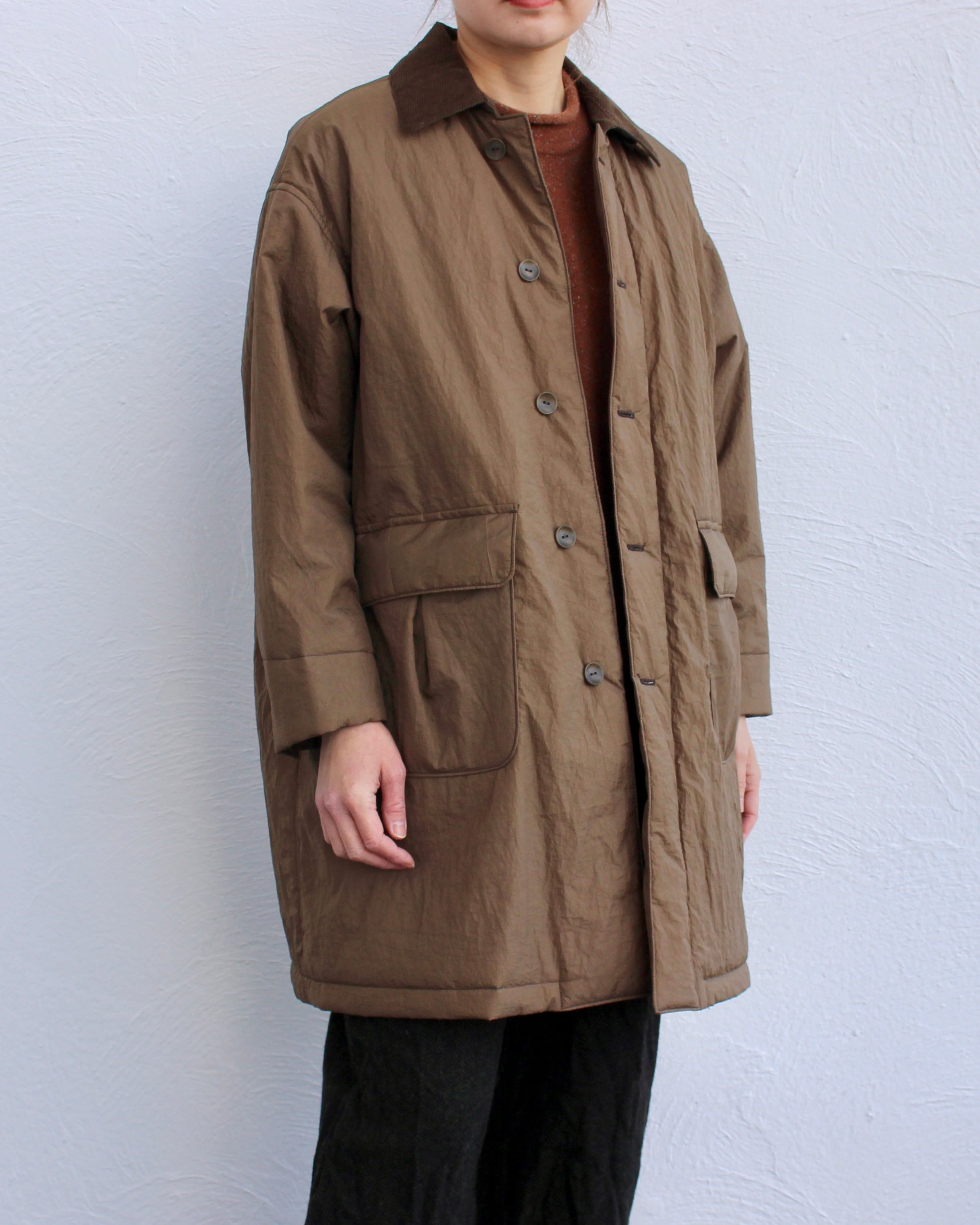 ゆったりとオーバーサイズの中綿入りステンカラーコート。