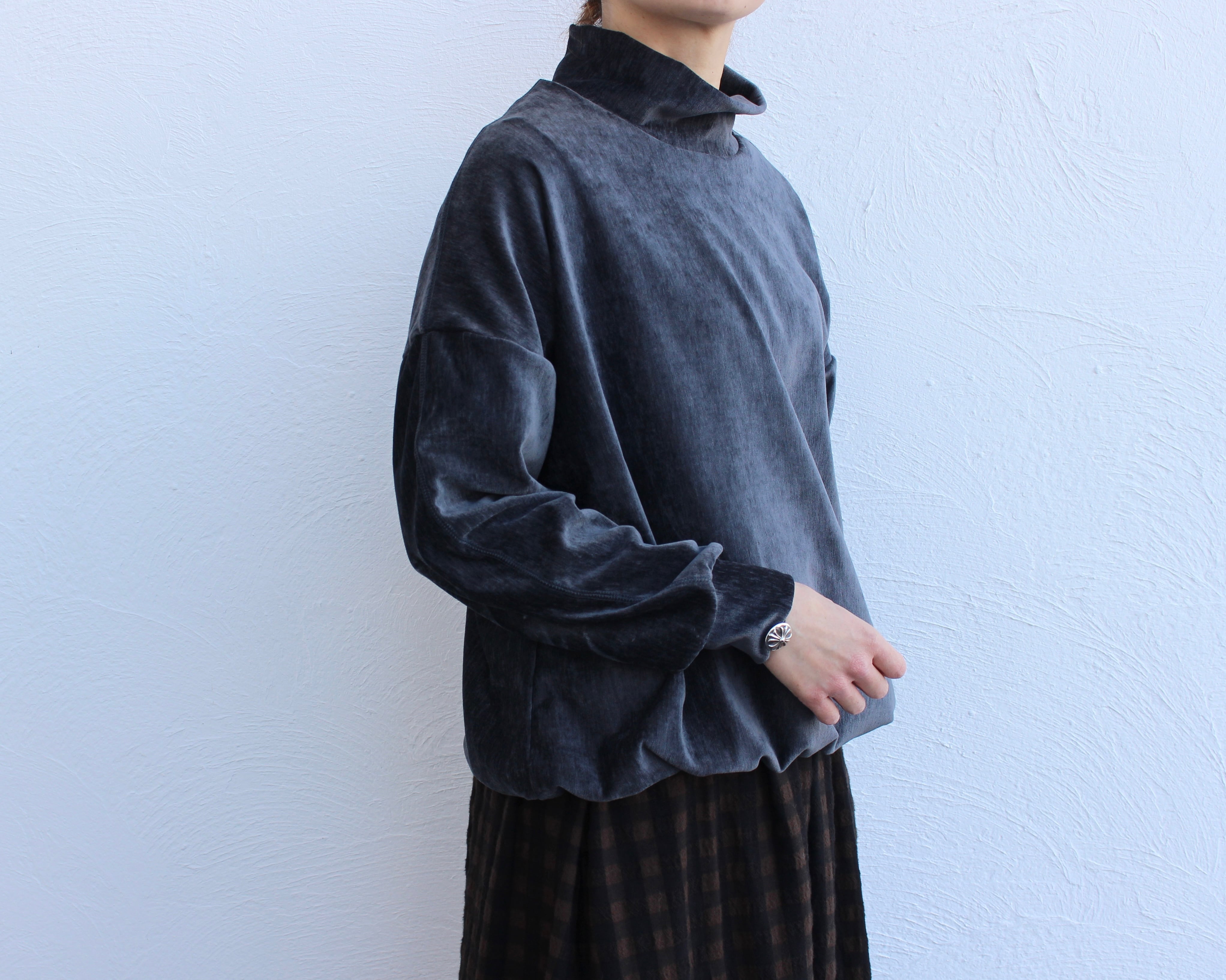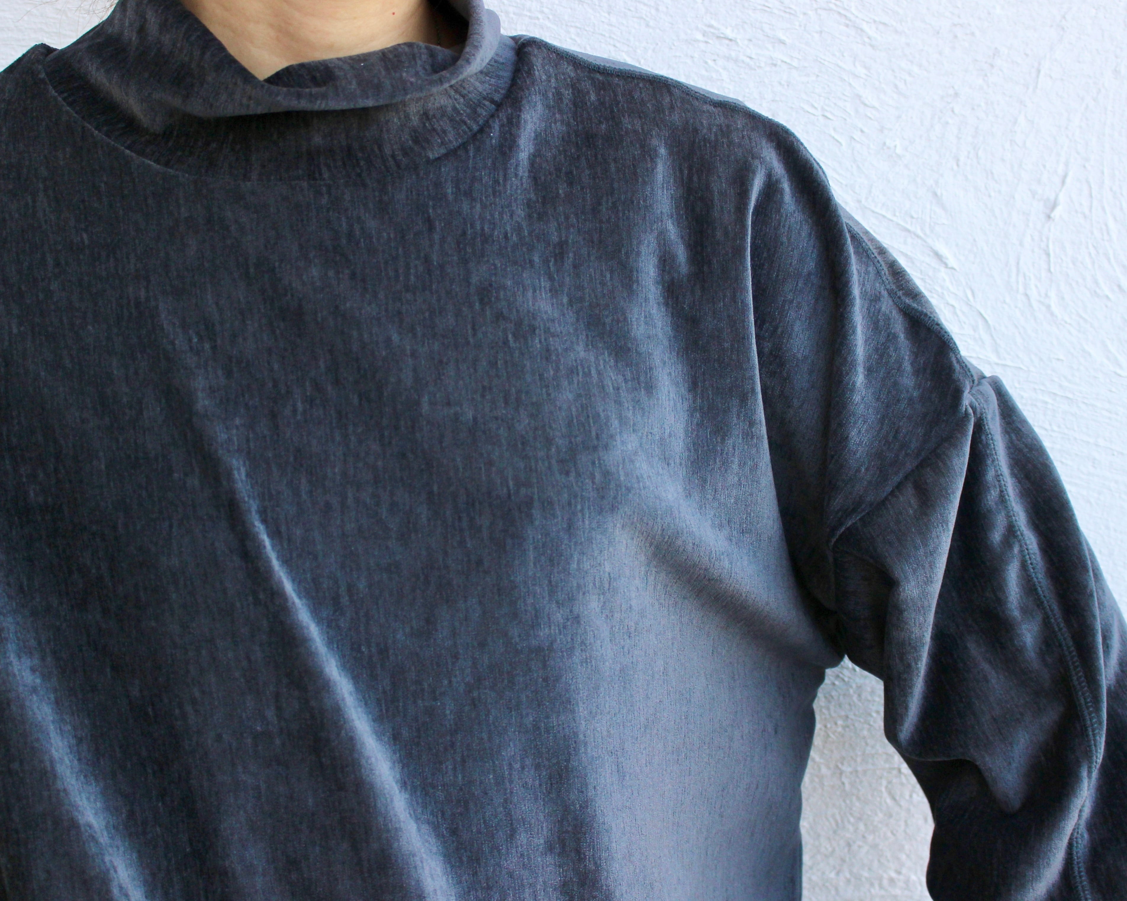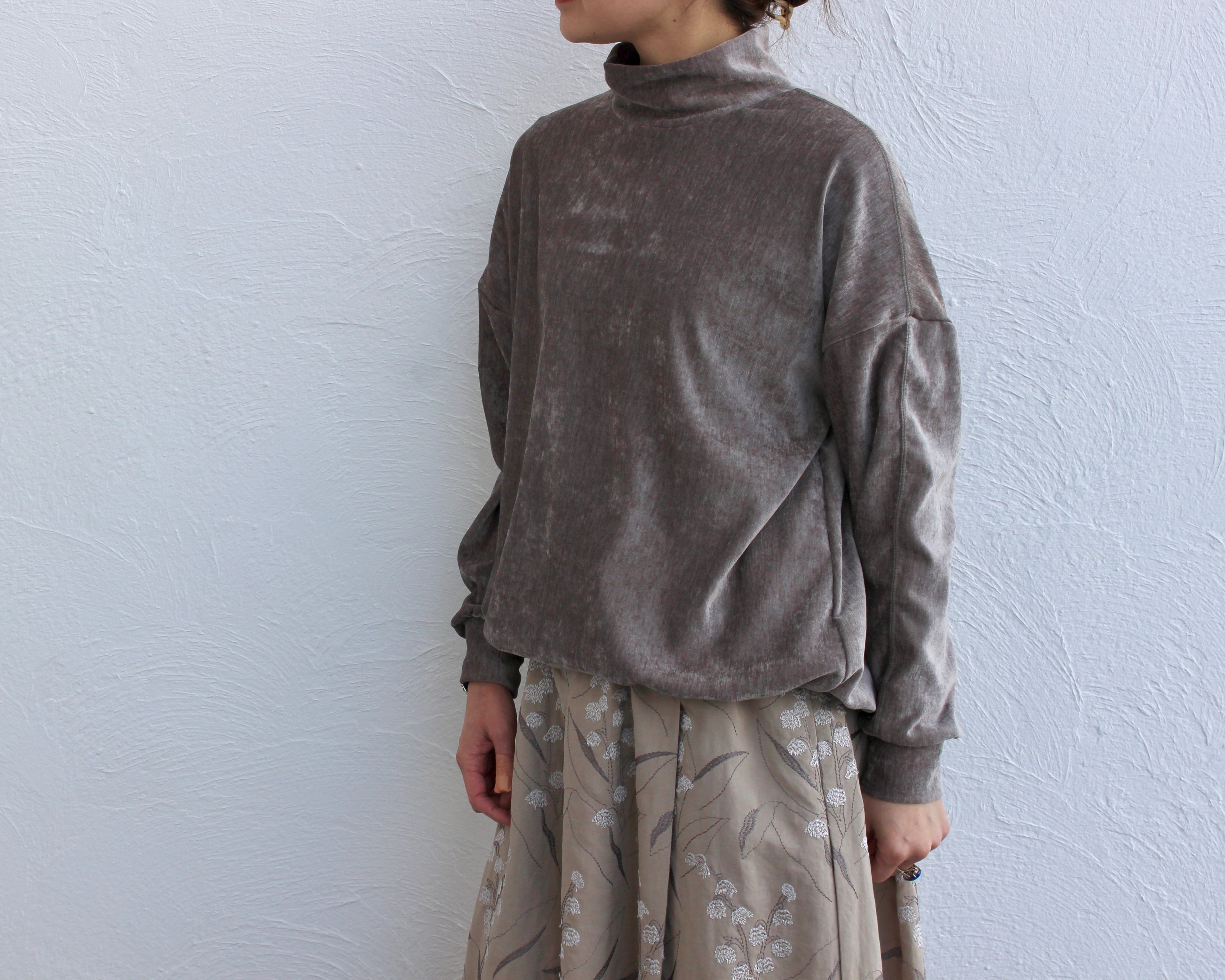 べロア調の綺麗めな起毛感が目を引くハイネックプルオーバー。