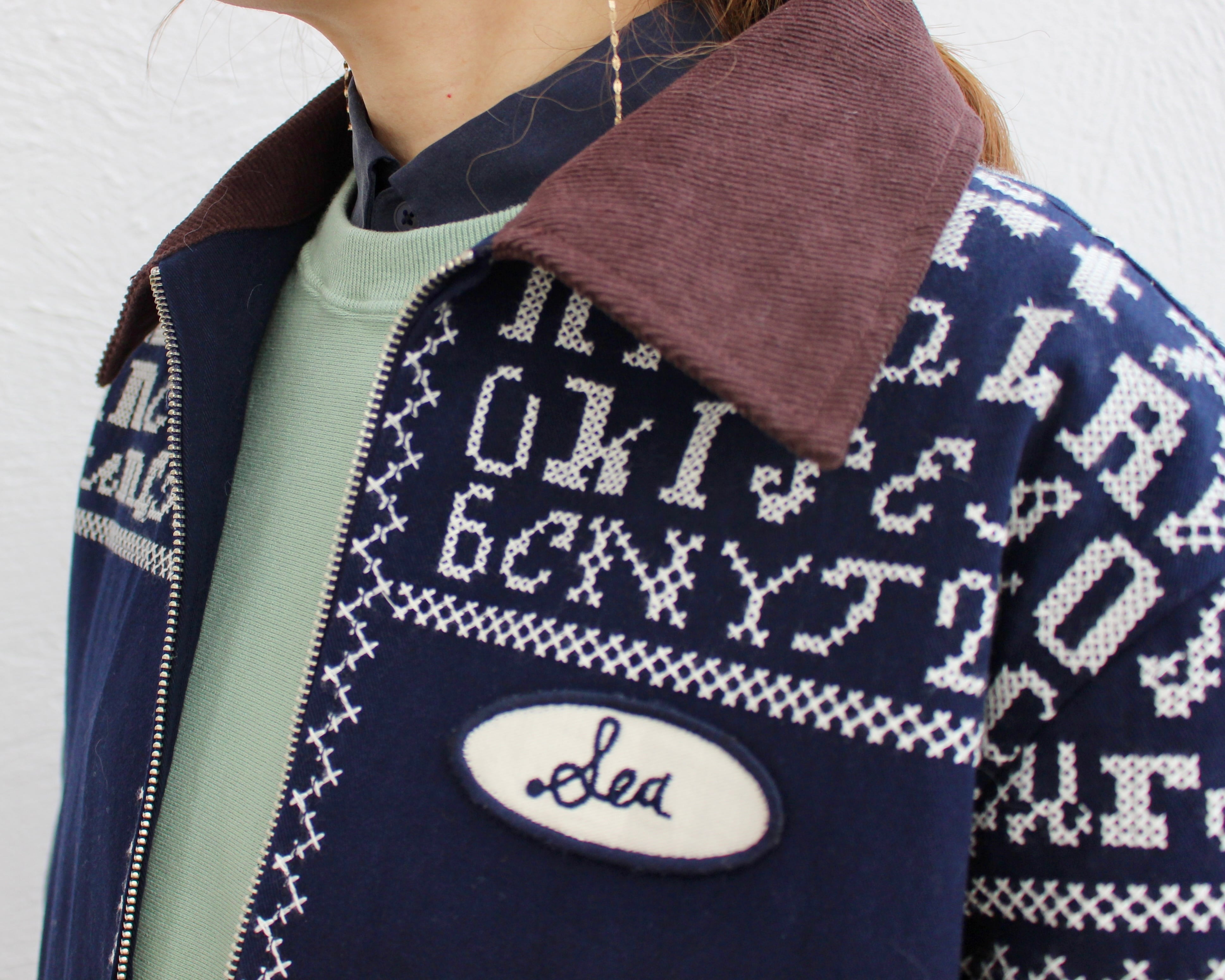 全体に施された繊細なクロスステッチと英文字刺繍、