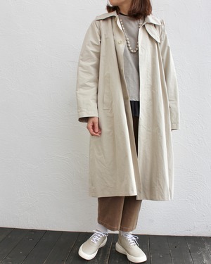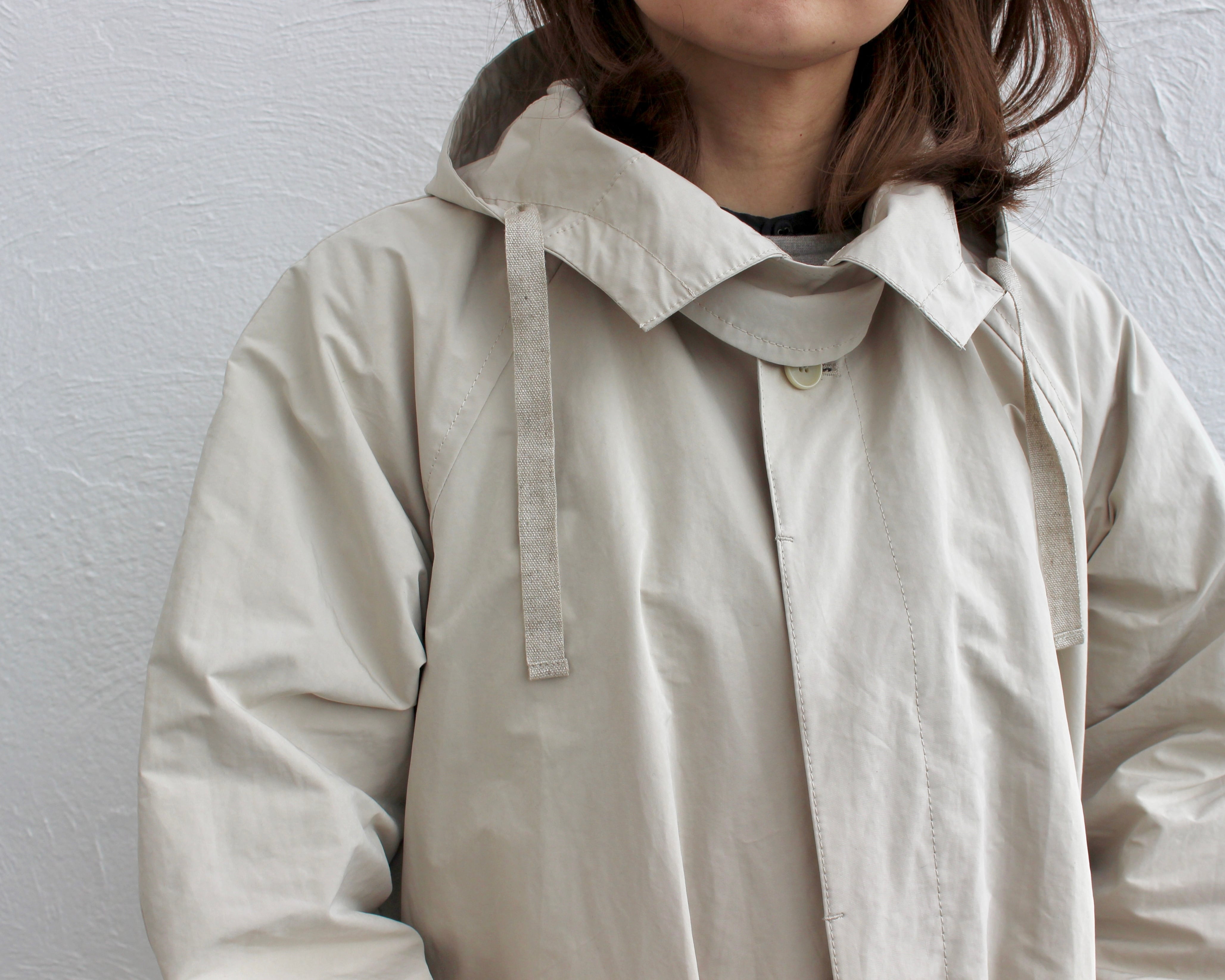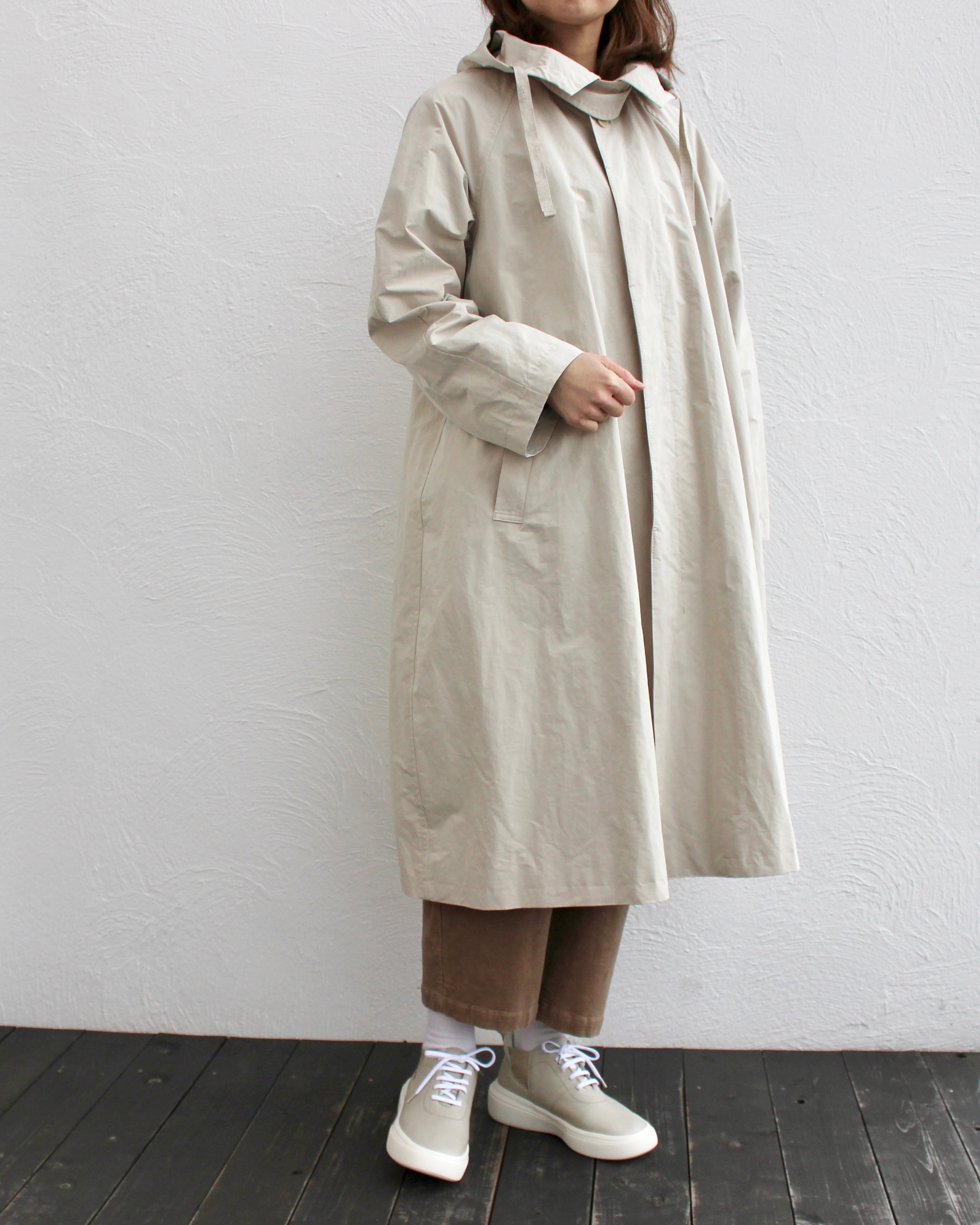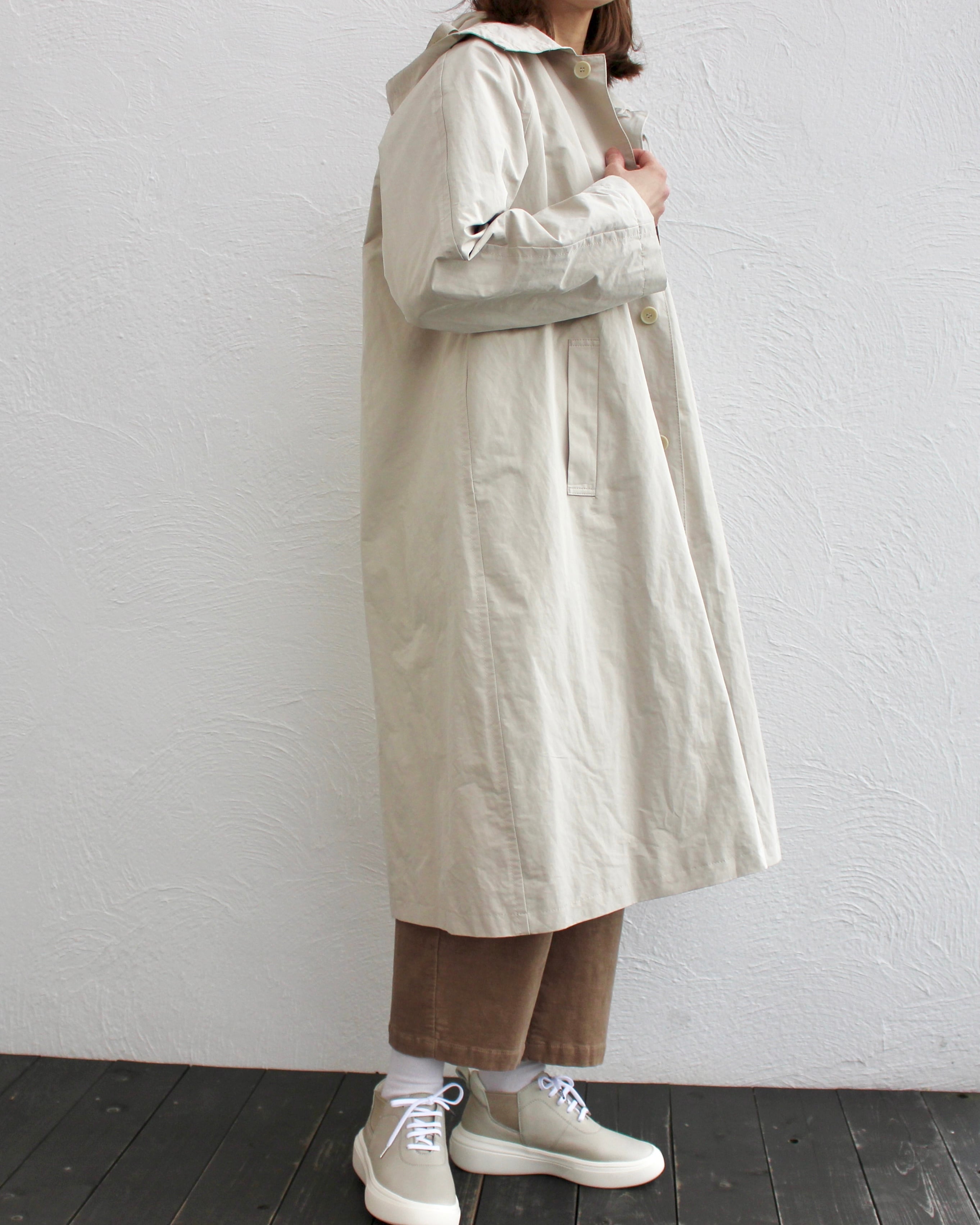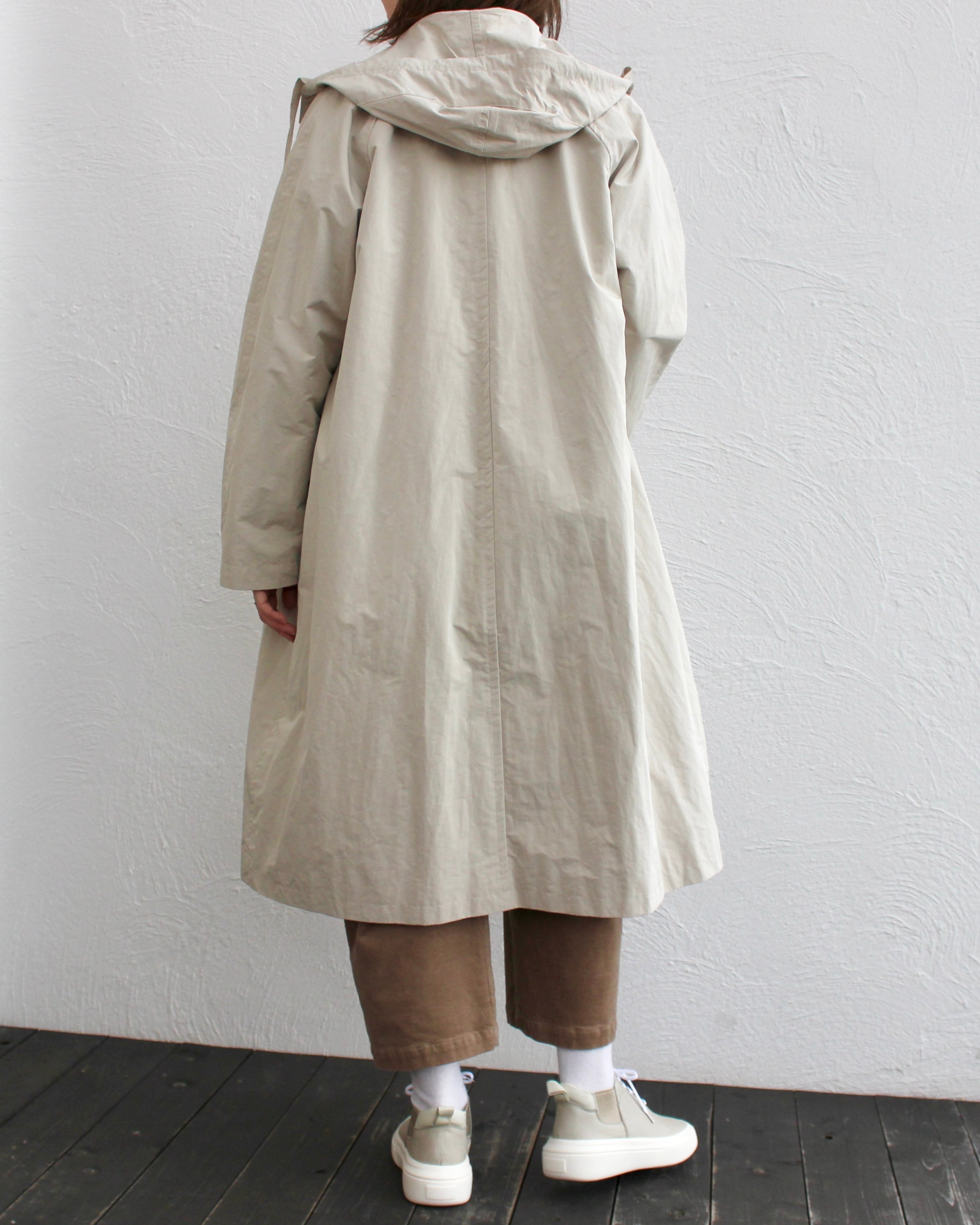 比翼仕立てのフード付きロングコートはフェミニンなAラインのカジュアルシルエット。