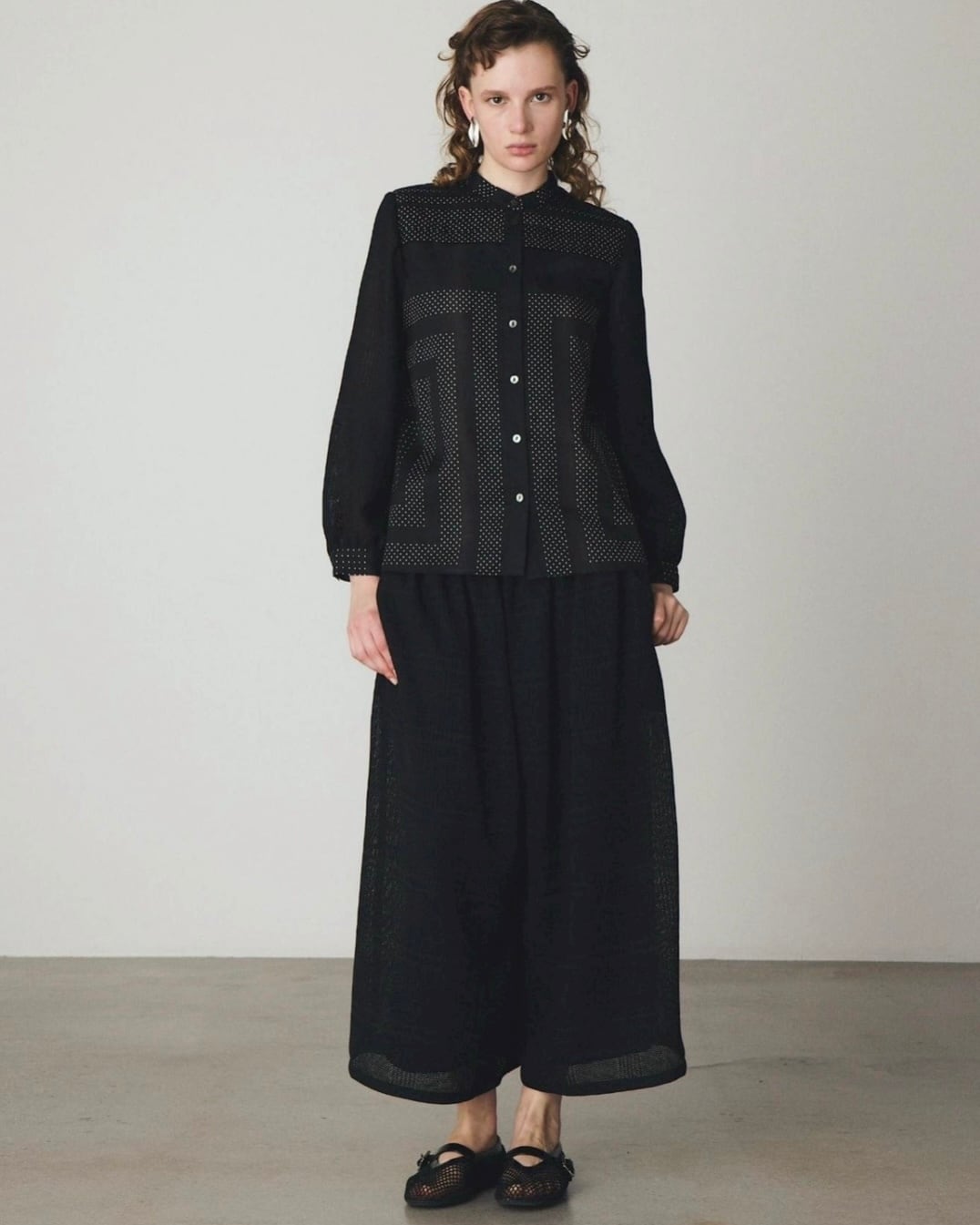 袖はカラミ素材に切り替え、夏でも快適に着られるブラウスに。