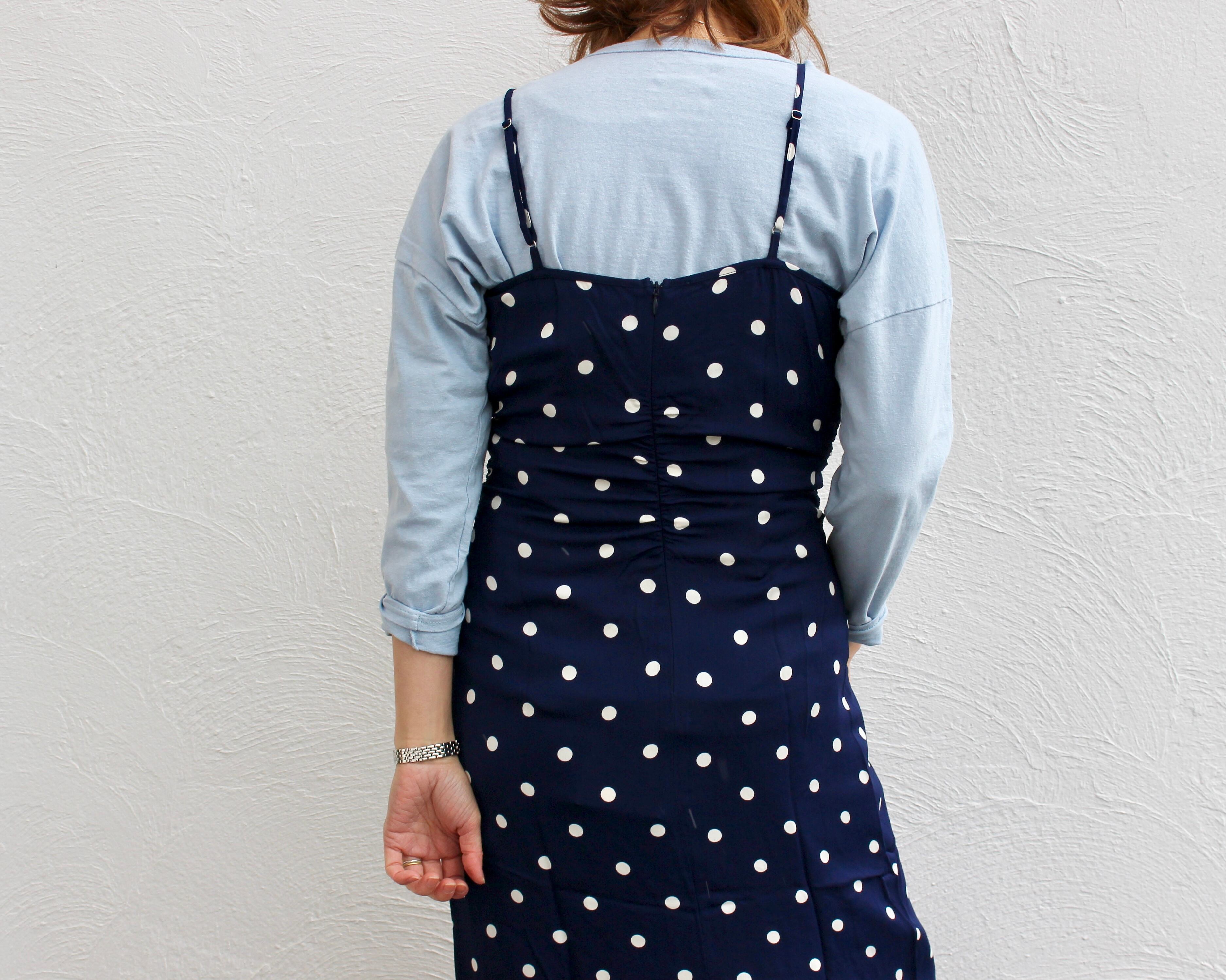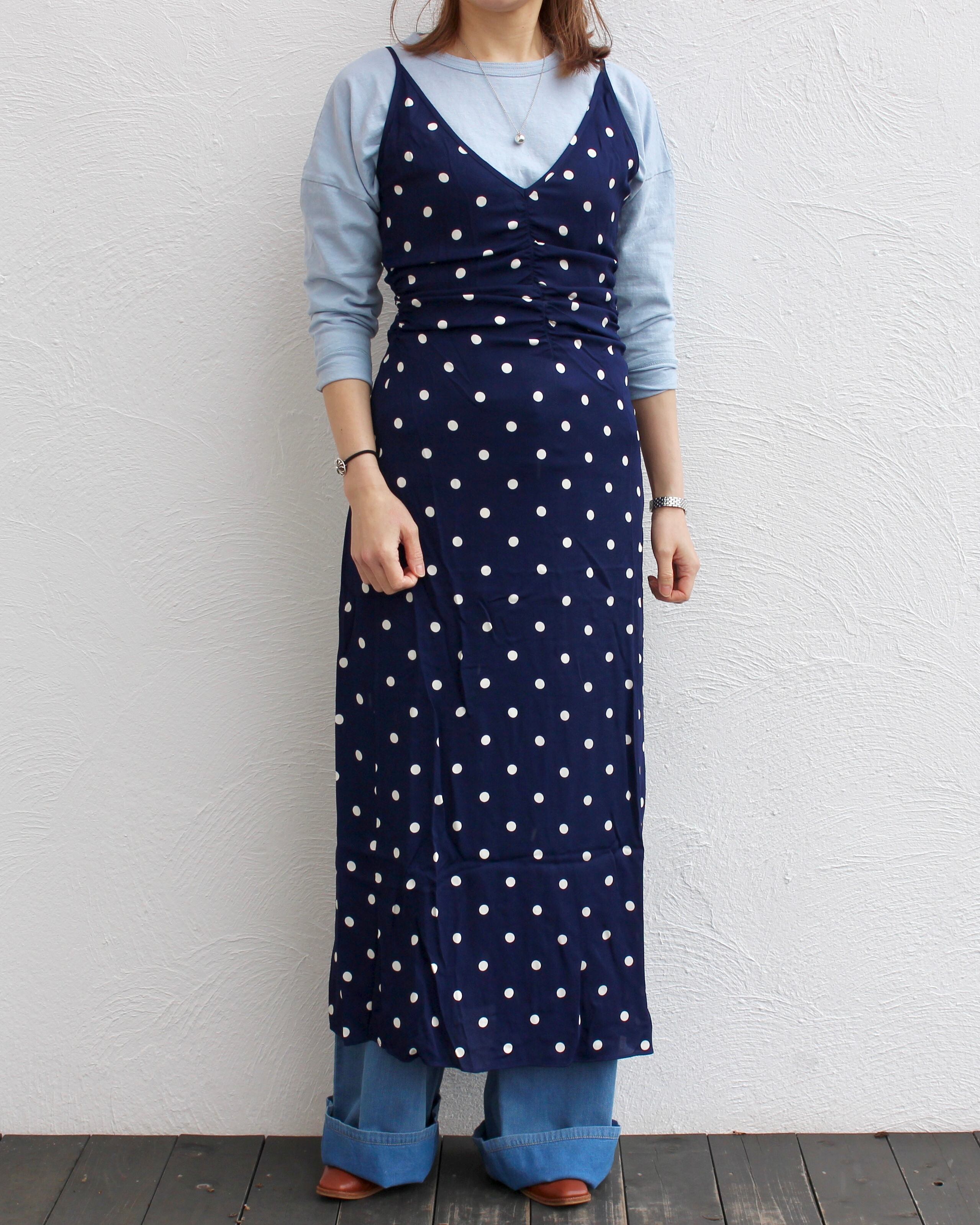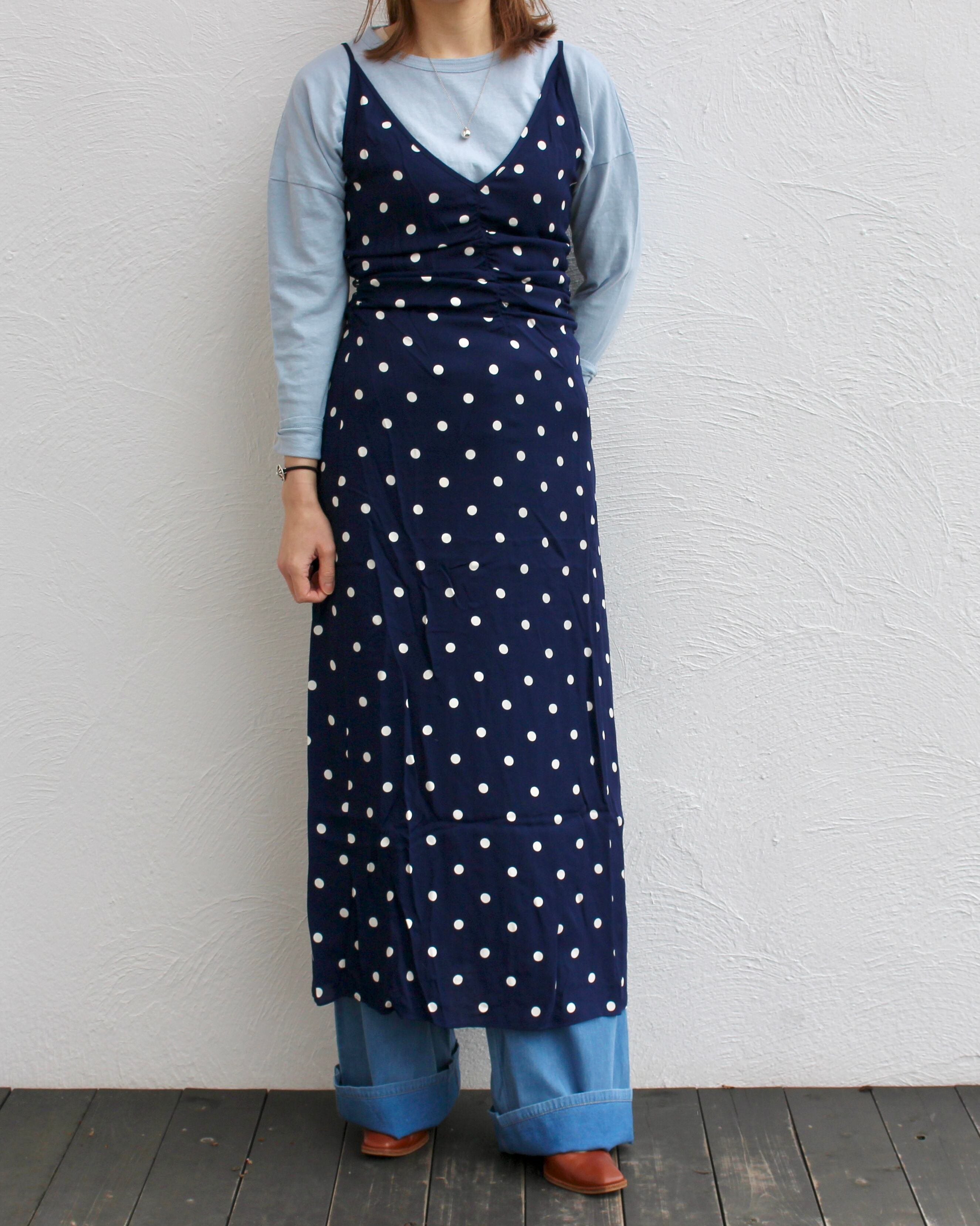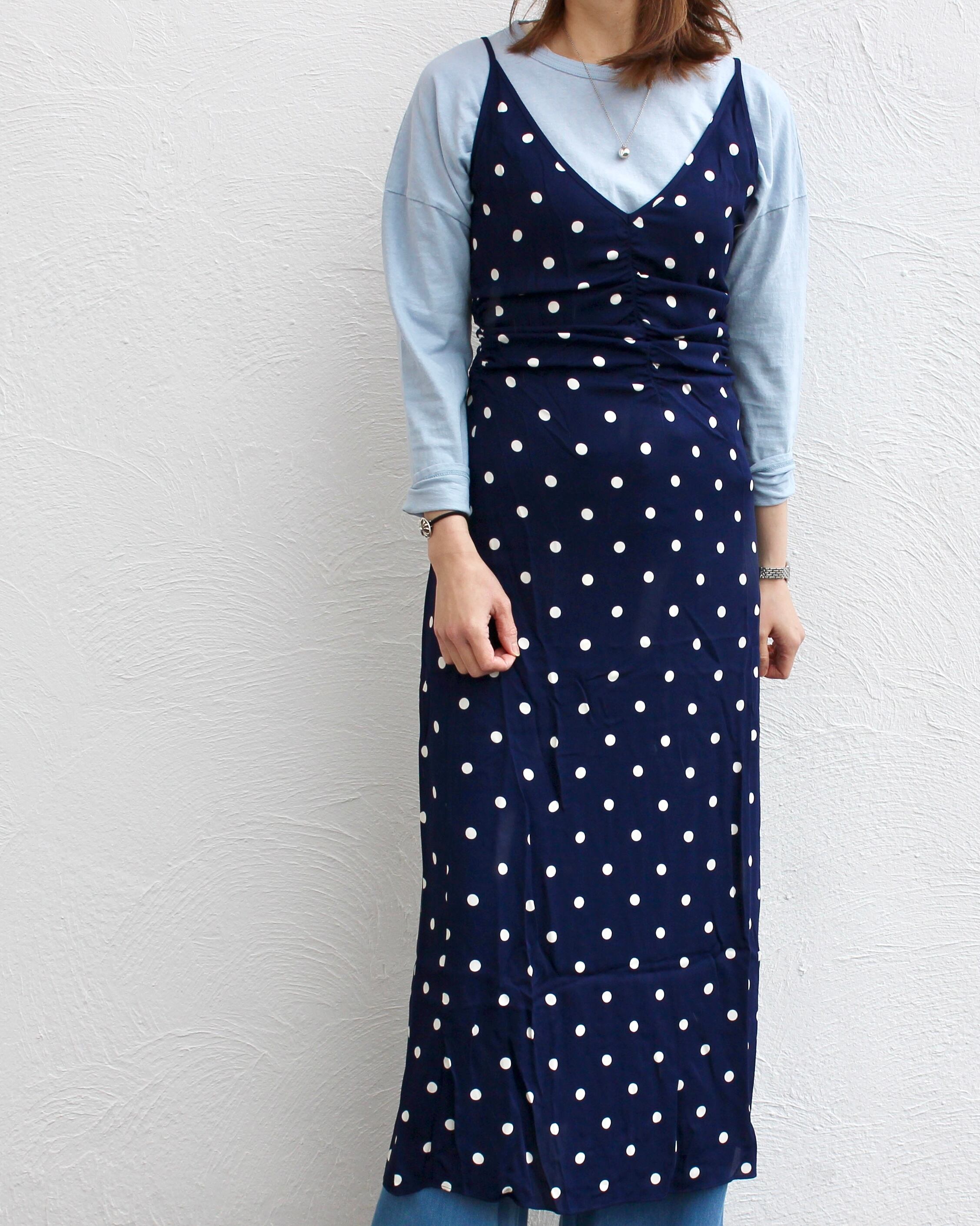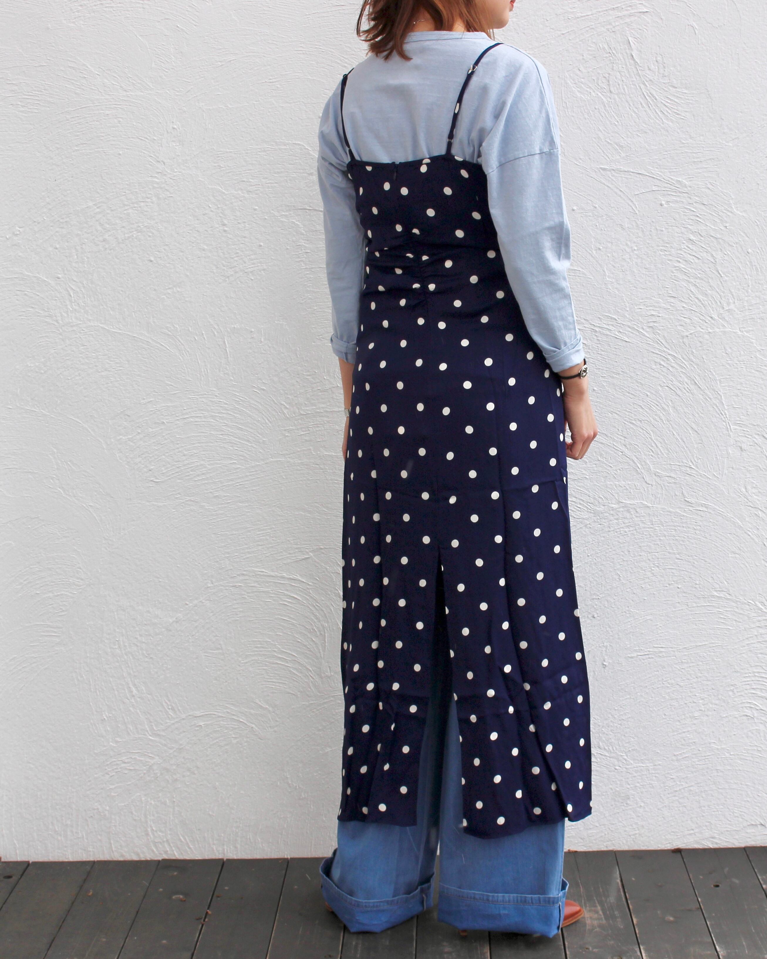 シンプルなドットプリントのワンピースはキャミソール型で、