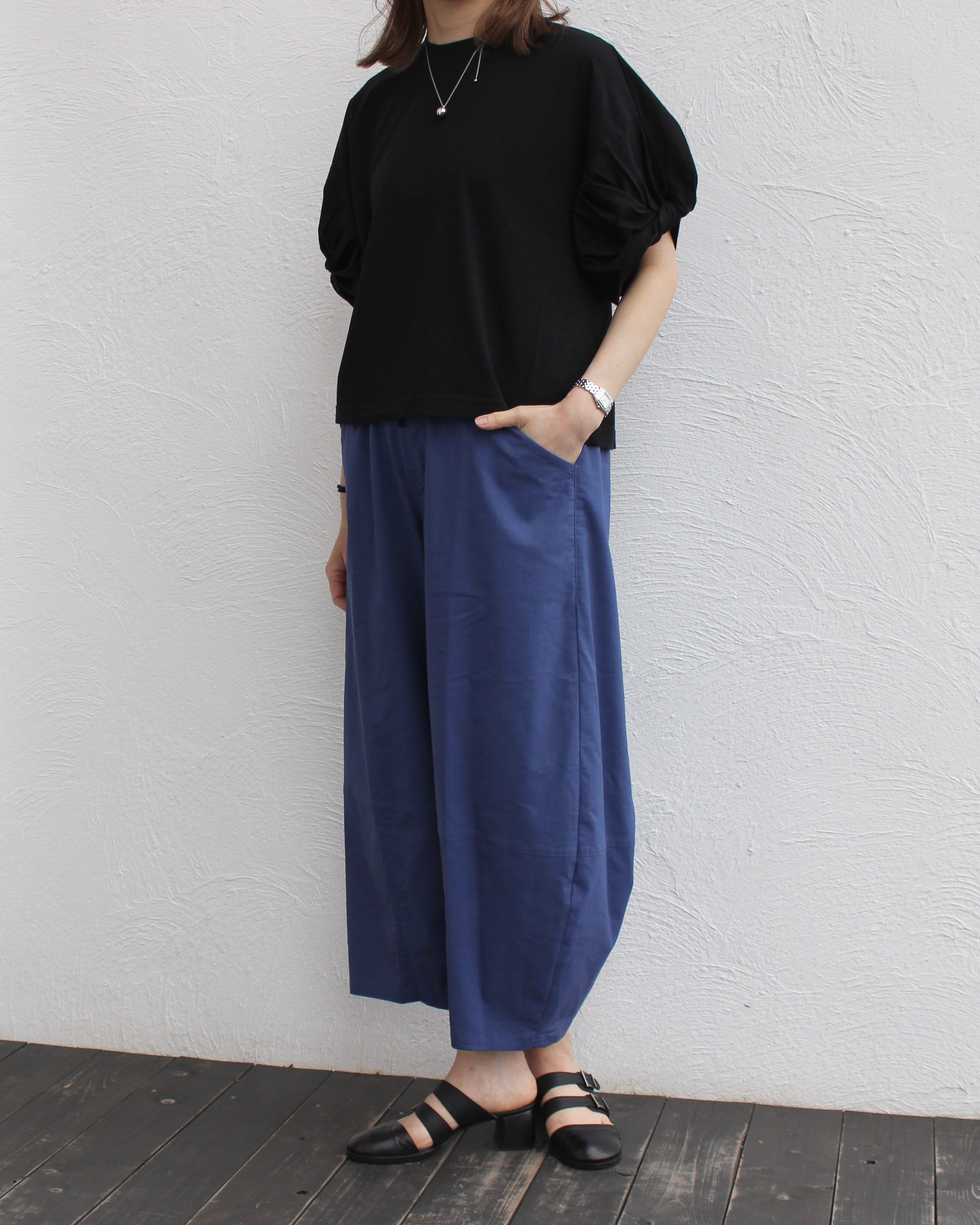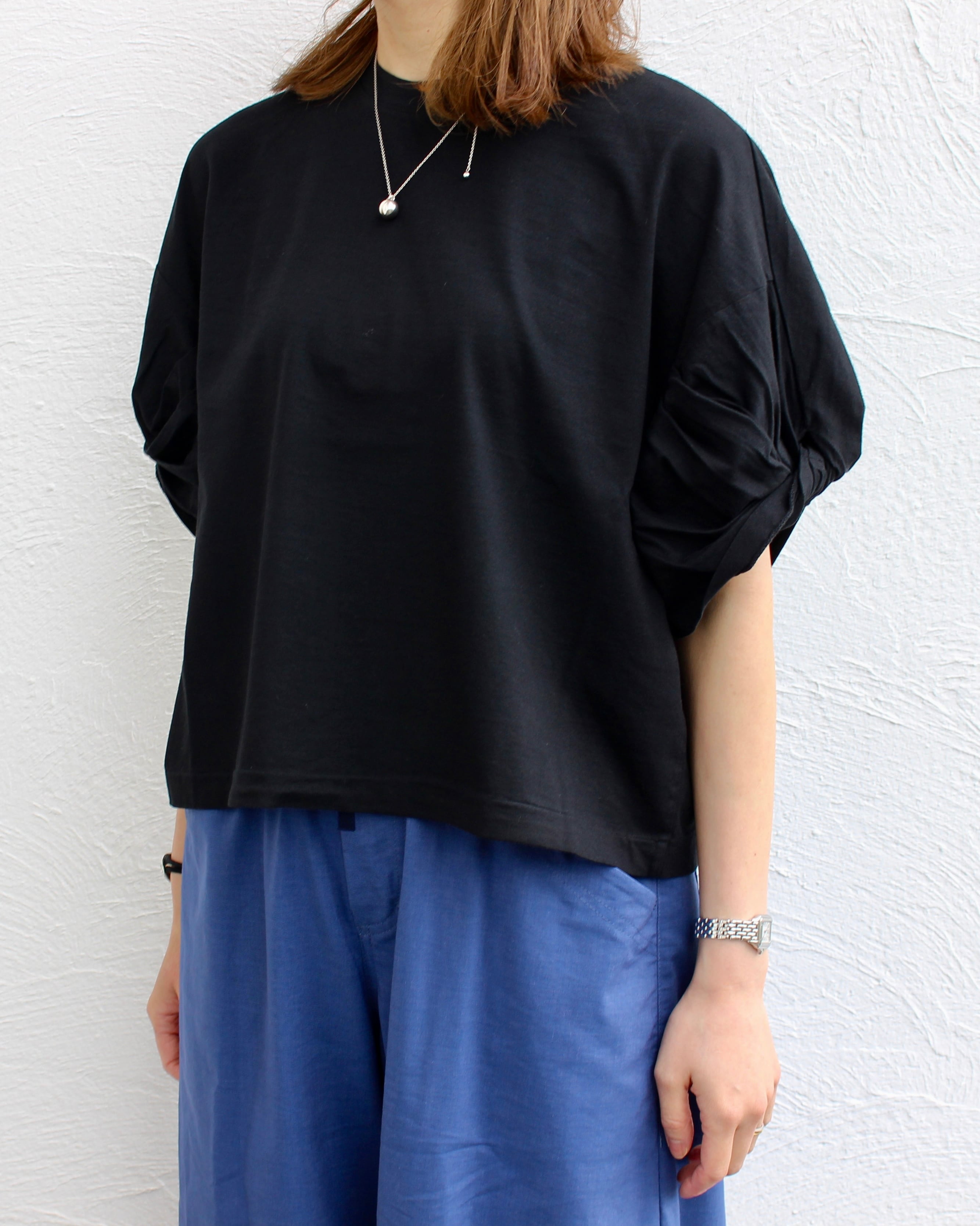 袖に捻じりを施し、リボンのようなふわっとしたデザインのTシャツ。