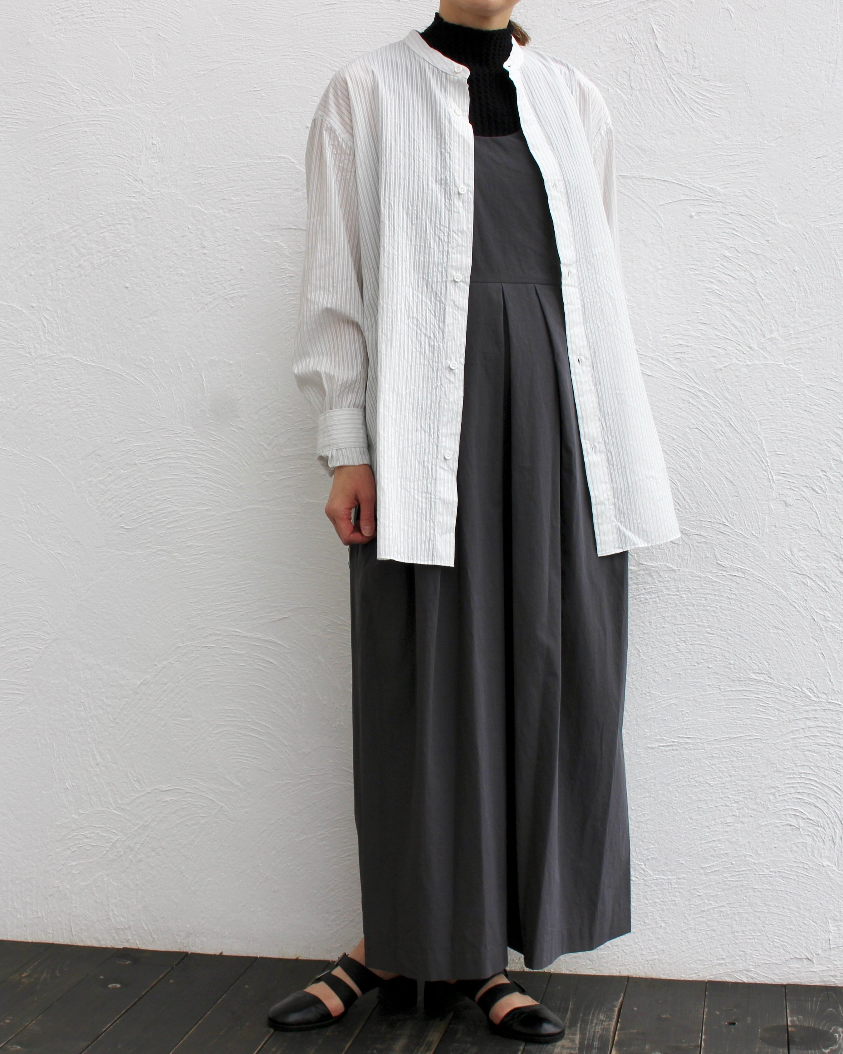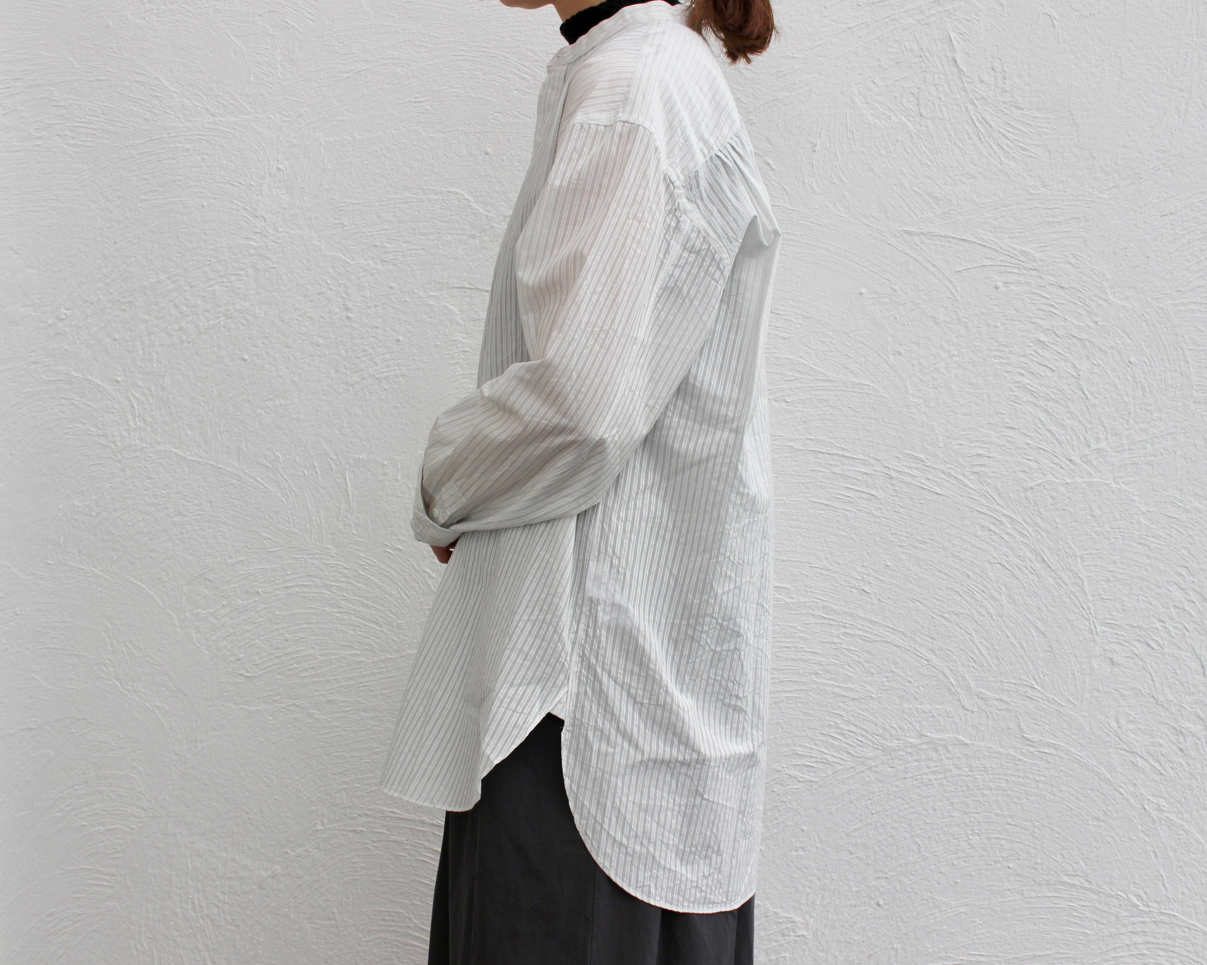 シアーな透け感があるようなストライプが特徴の、ストライプが美しいバンドカラーシャツ。