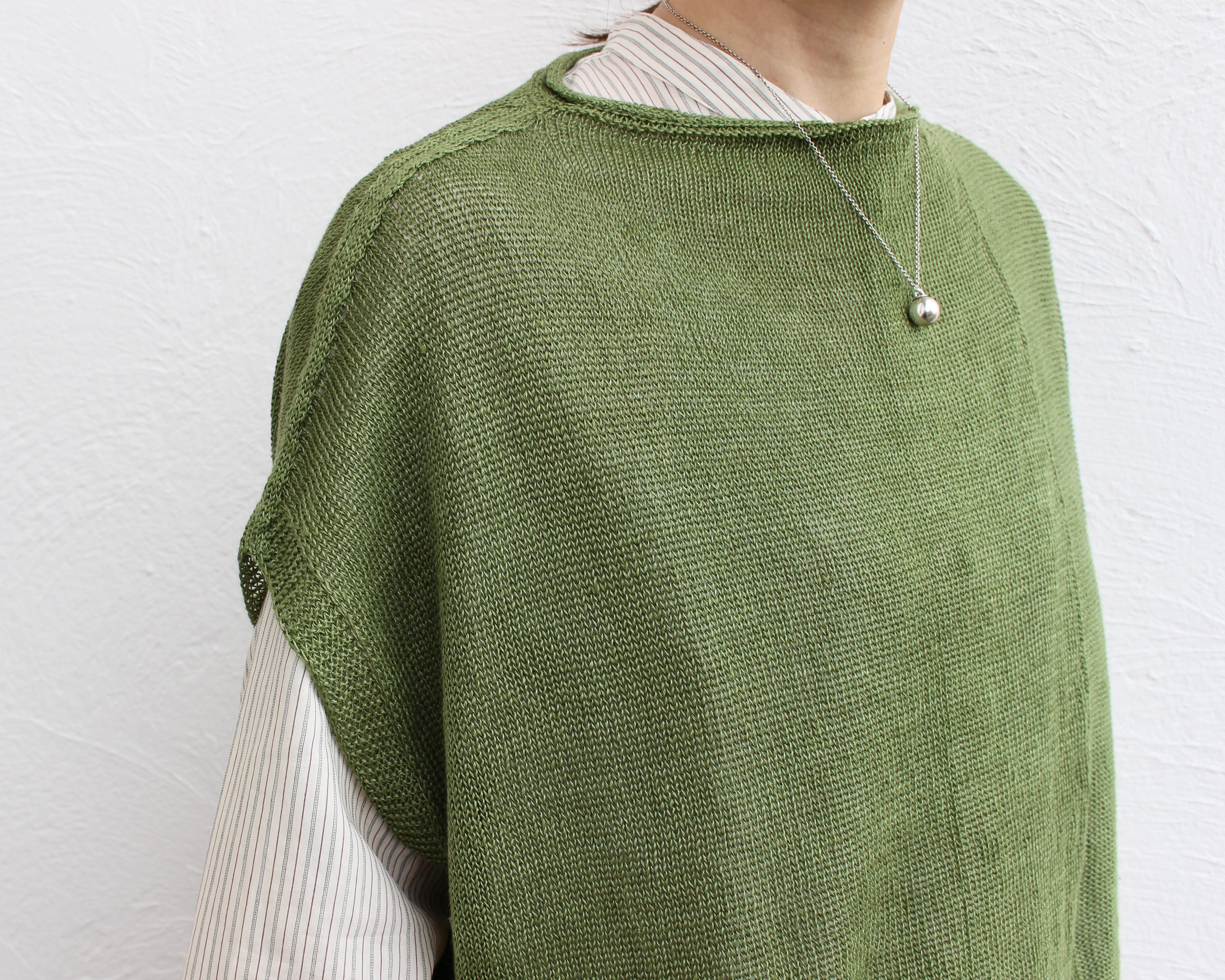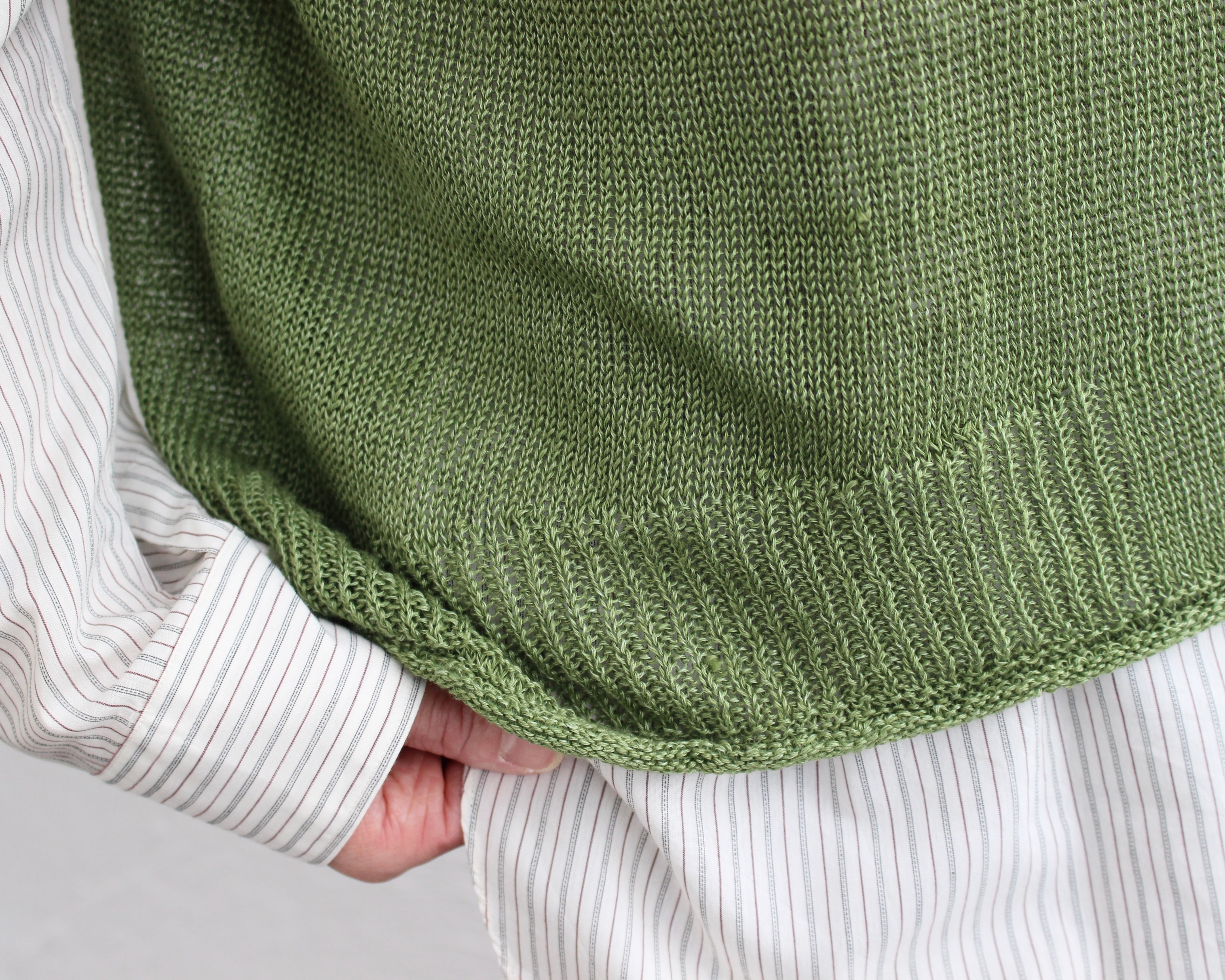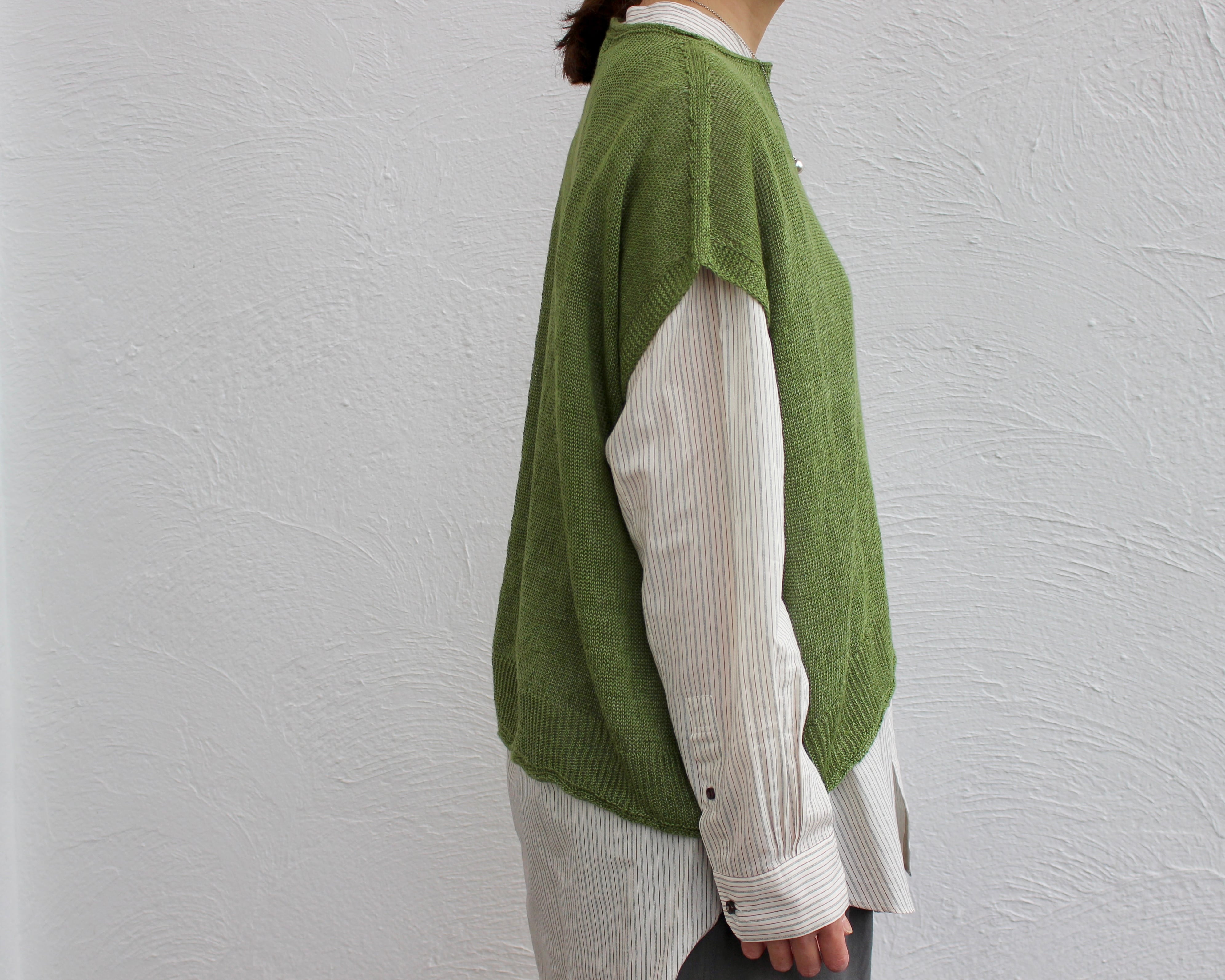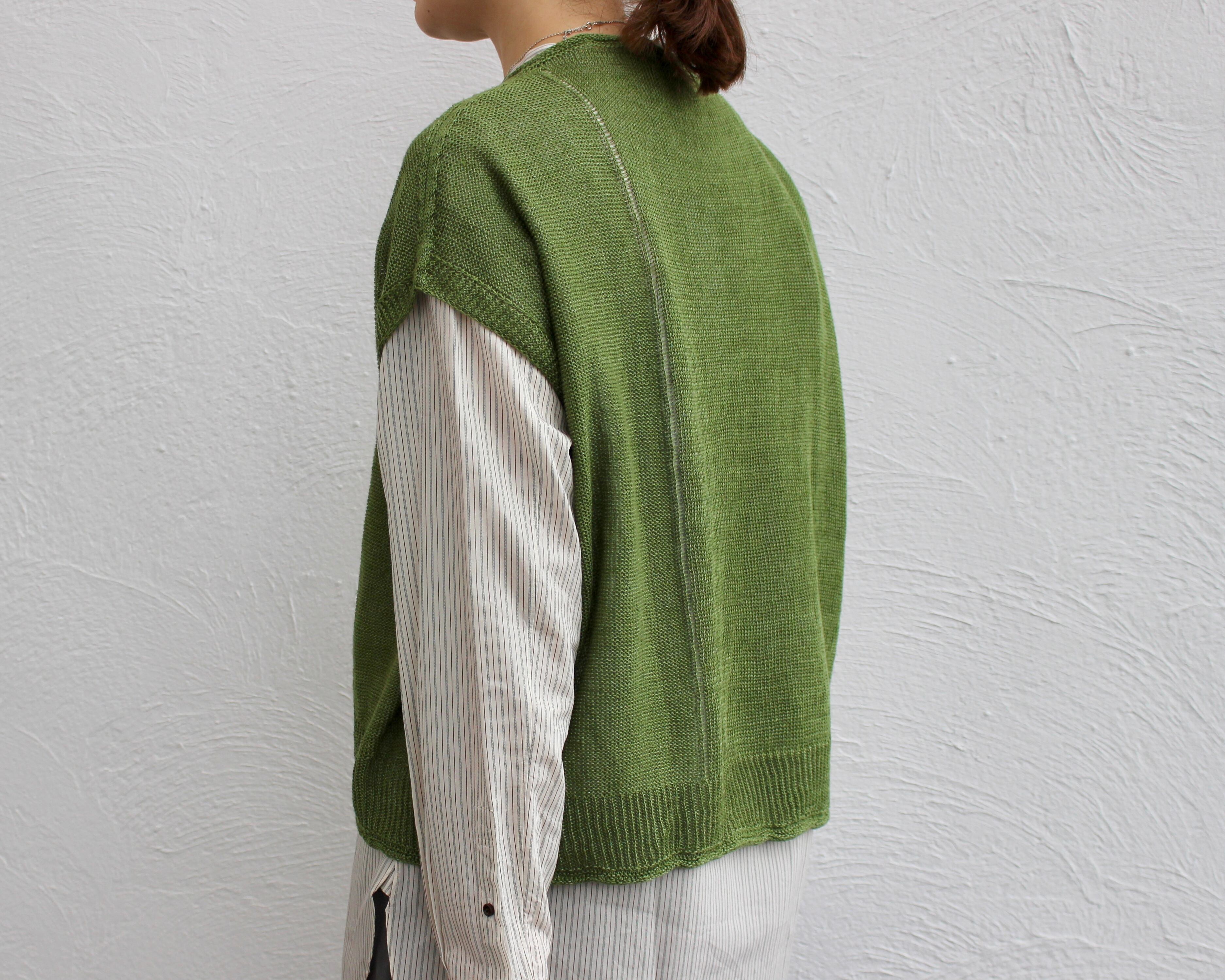 編みのテクニックだけで着丈の前後差をつけ、あえて1目を大きくした針抜き柄で清涼感を出しています。