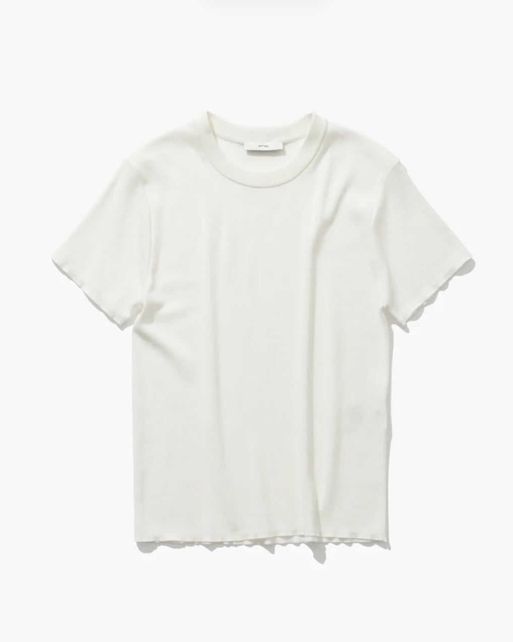 パンツのベルトが隠れるくらいのすっきりとした着丈で、すっきりした襟ぐりも特徴。